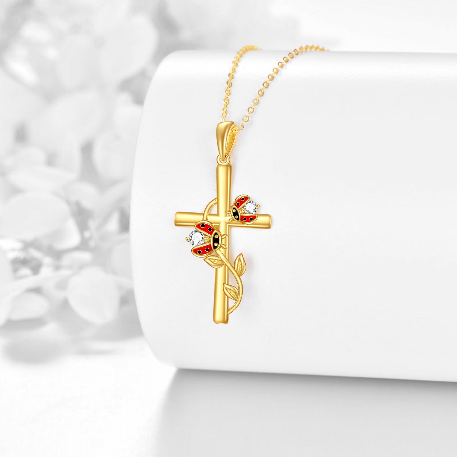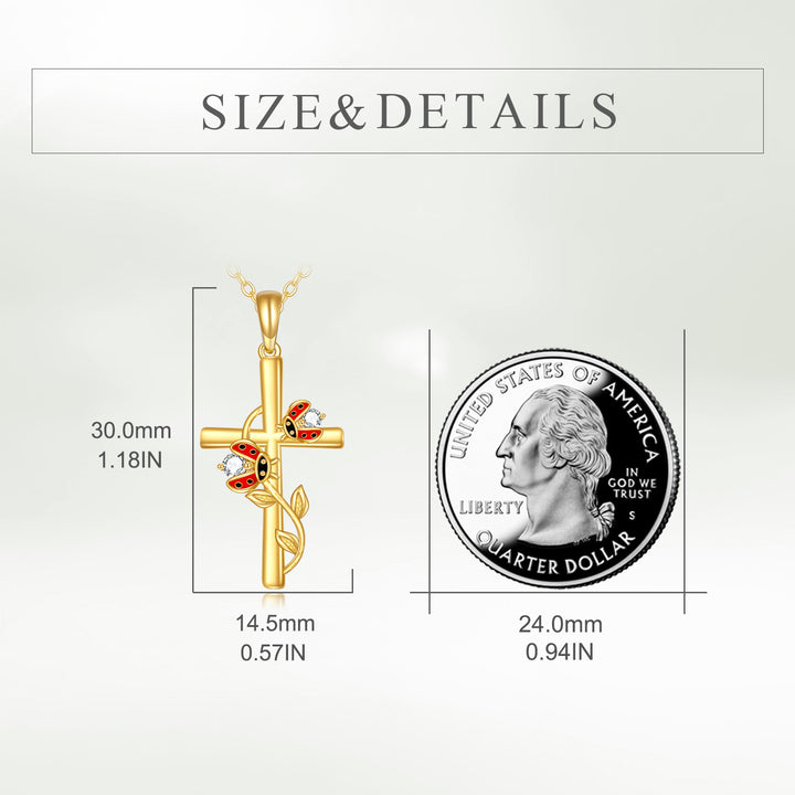 This Pendant Necklace is crafted from Luxurious 14K Gold, Featuring a Ladybug and Classic Cross Design, Both Adorned with High-Quality Cubic Zirconia.