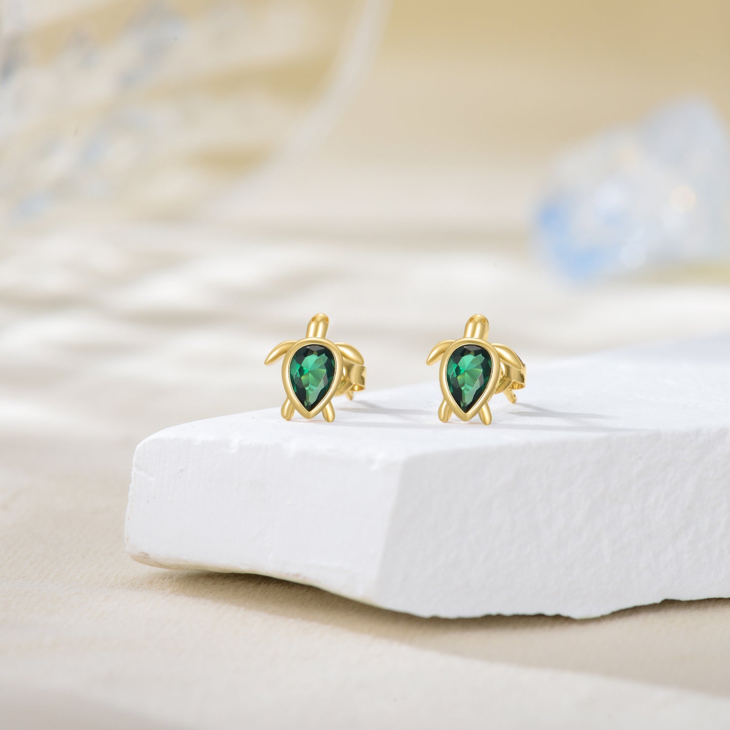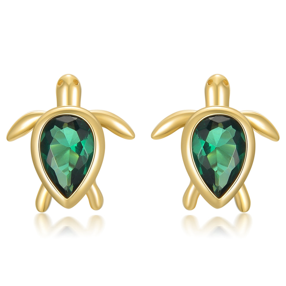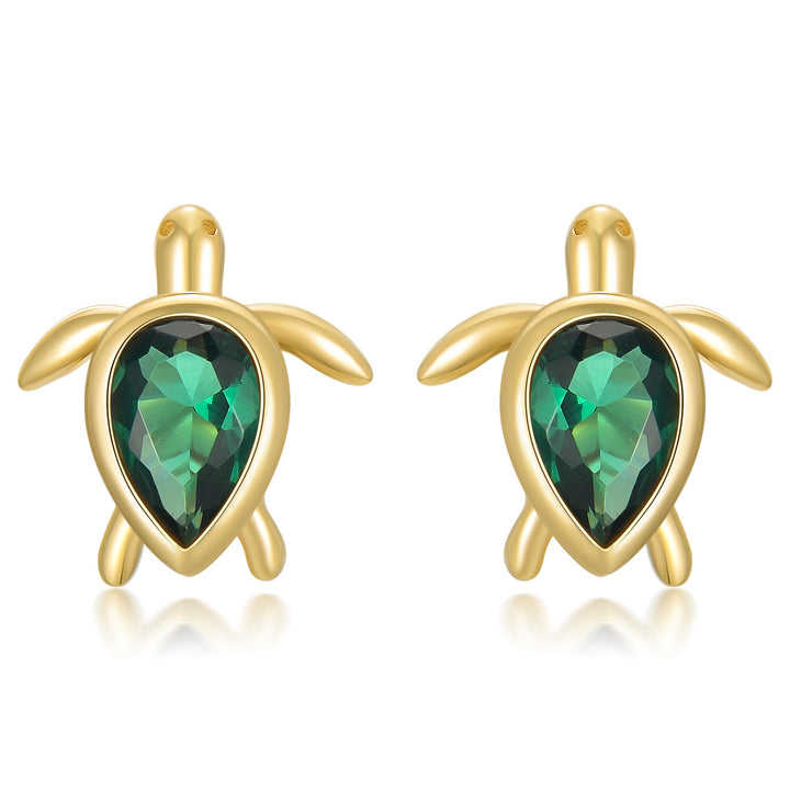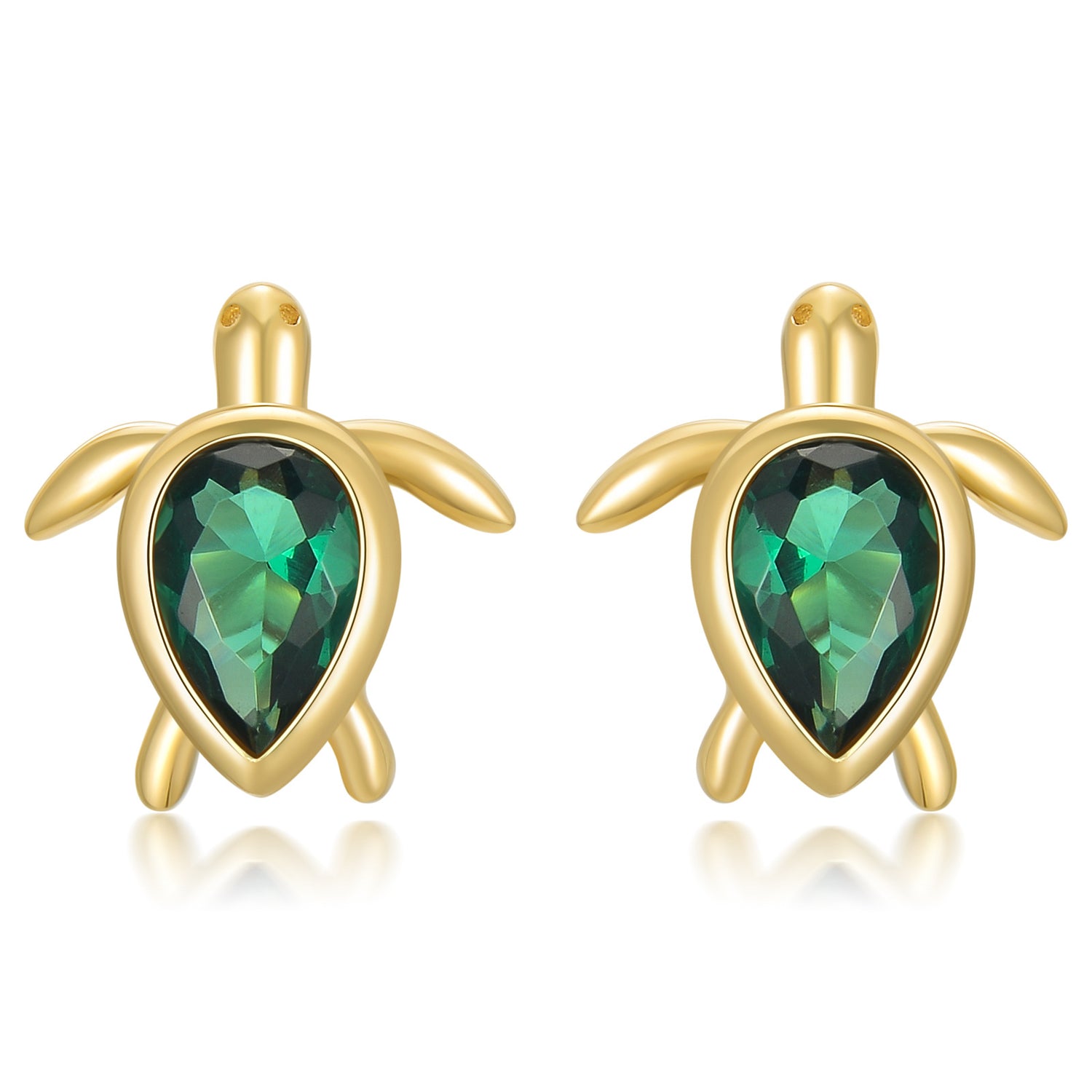 14K Yellow Gold Pear Emerald Cubic Zirconia Sea Turtle Stud Earrings