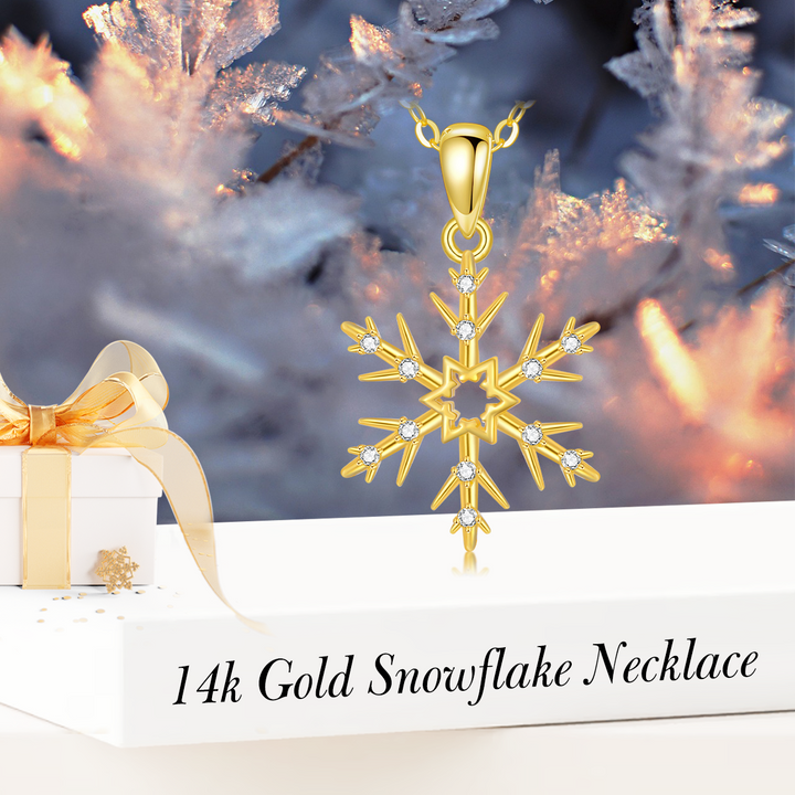 Crafted from solid 14K Gold. This is a Pendant Necklace featuring a Snowflake design, set with Moissanite stones.