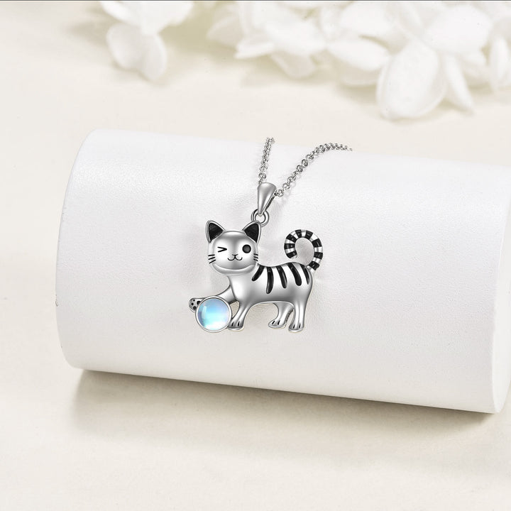 This Circular Shaped Pendant Necklace is crafted from High-Quality Sterling Silver in Silver and Black Tones (Two-tone), Featuring a Mesmerizing Moonstone and an Enchanting Cat Design.