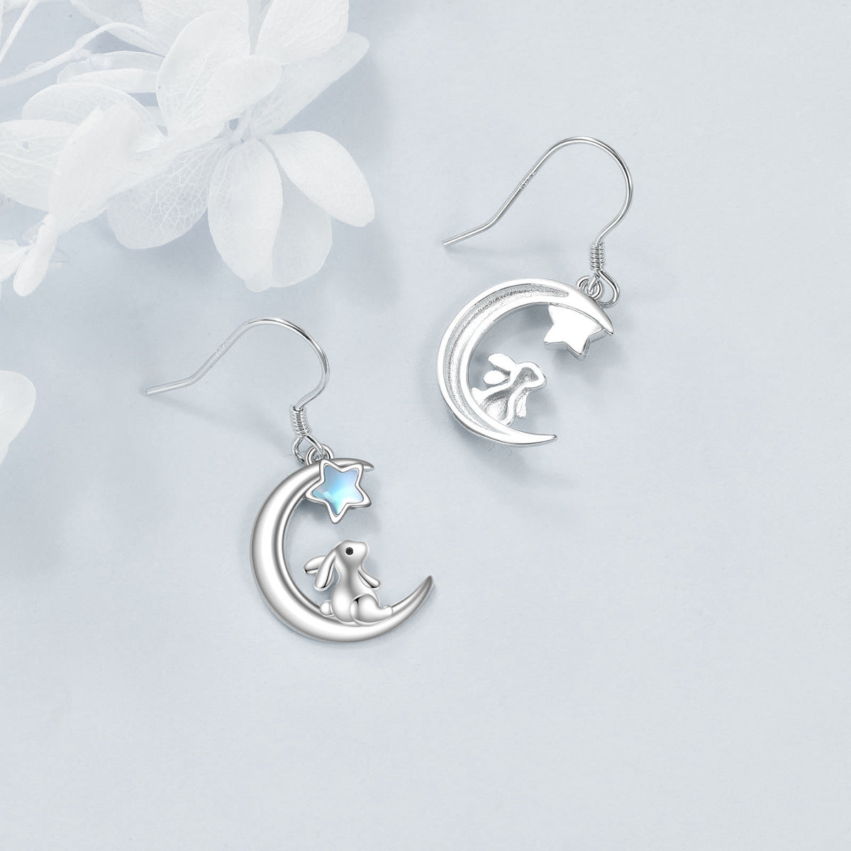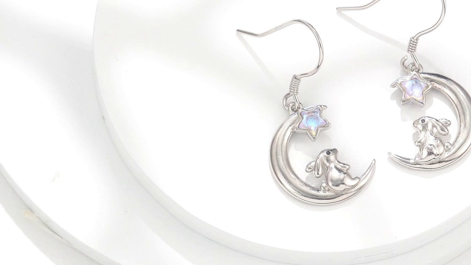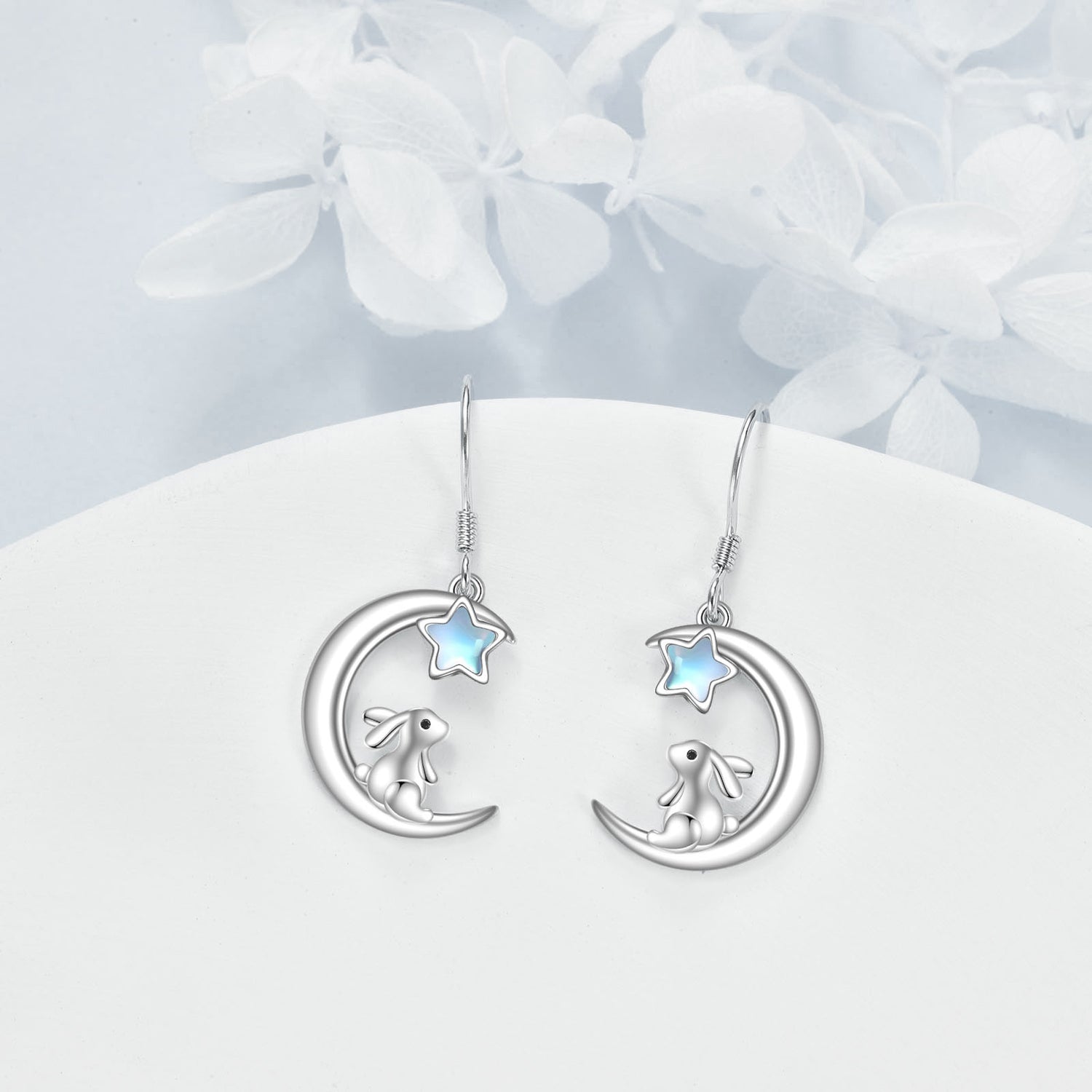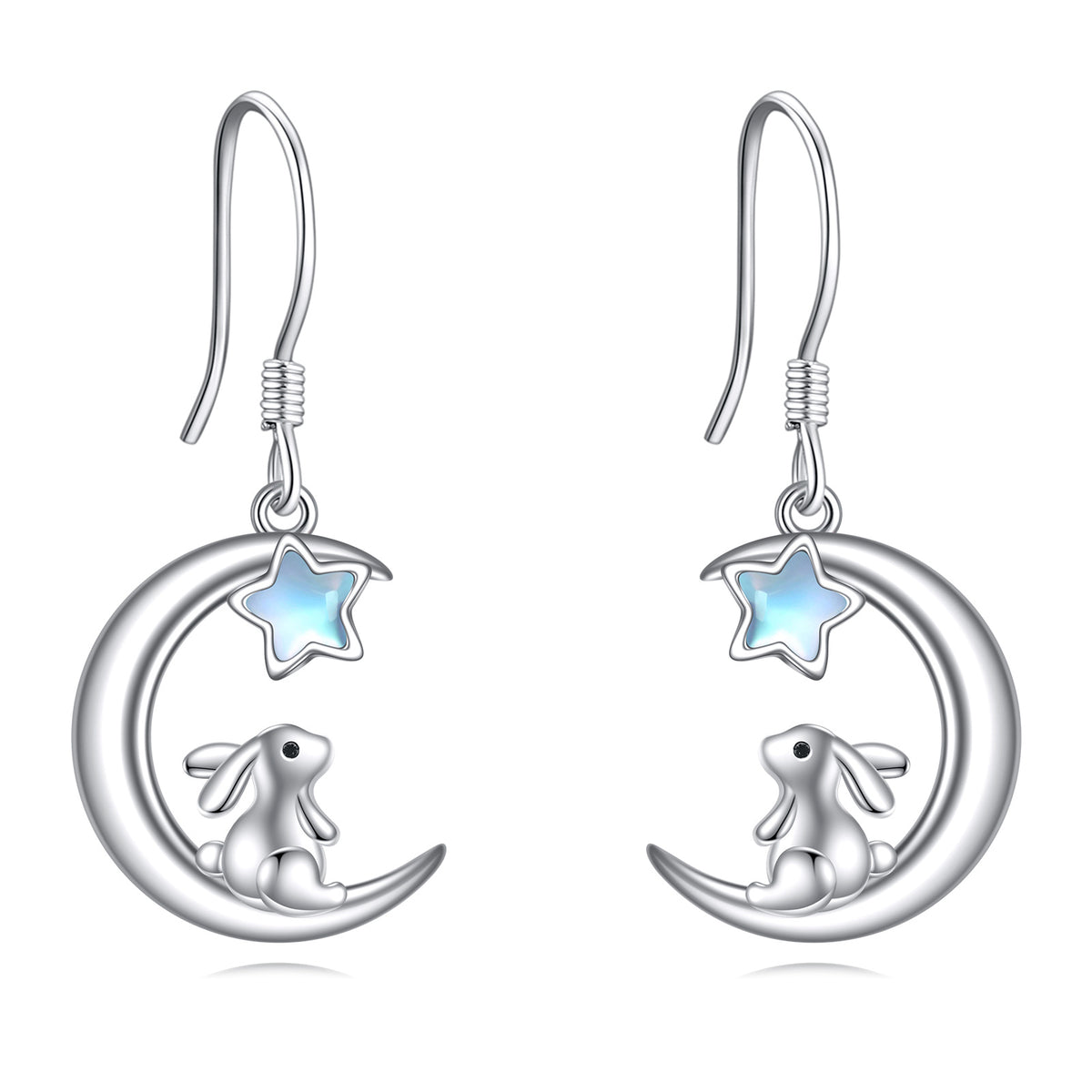 These Five-Pointed Star Shaped Drop Earrings are crafted from High-Quality Sterling Silver with White Gold Plating, Featuring Moonstones, Rabbits, and Moons.
