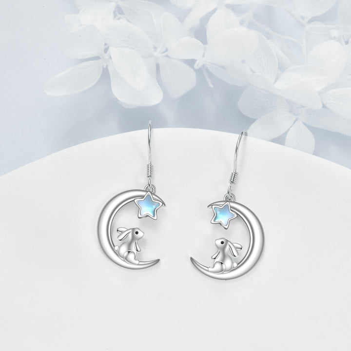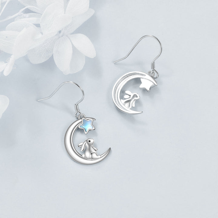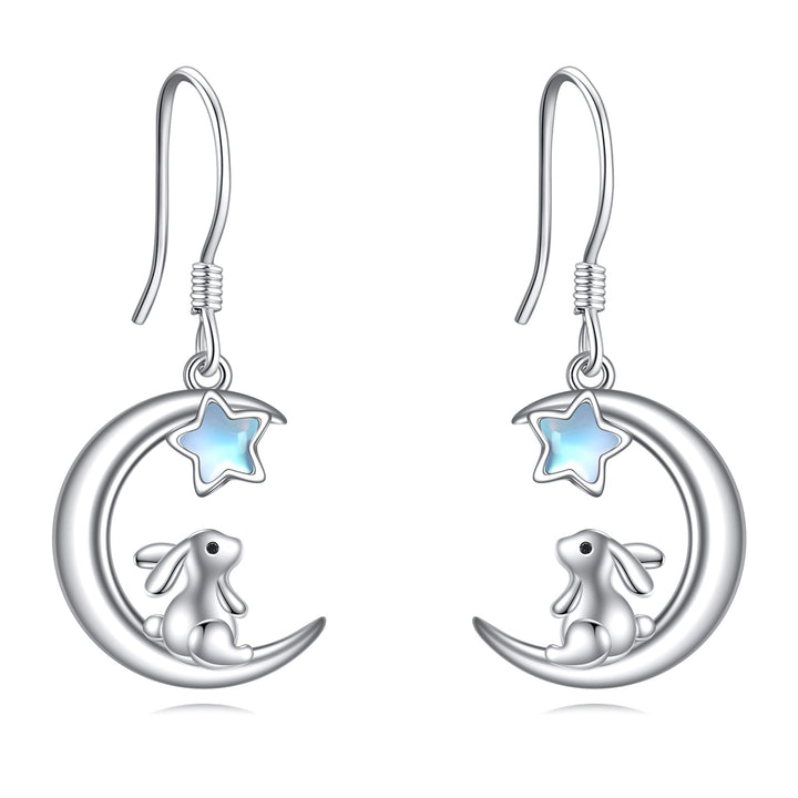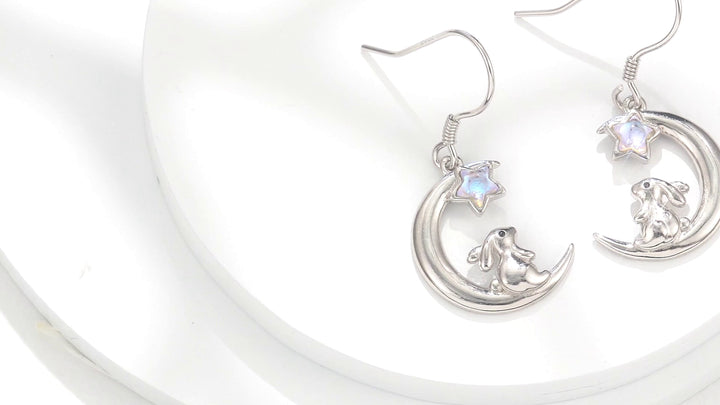 Sterling Silver Five-Pointed Star Shaped Moonstone Rabbit & Moon Drop Earrings