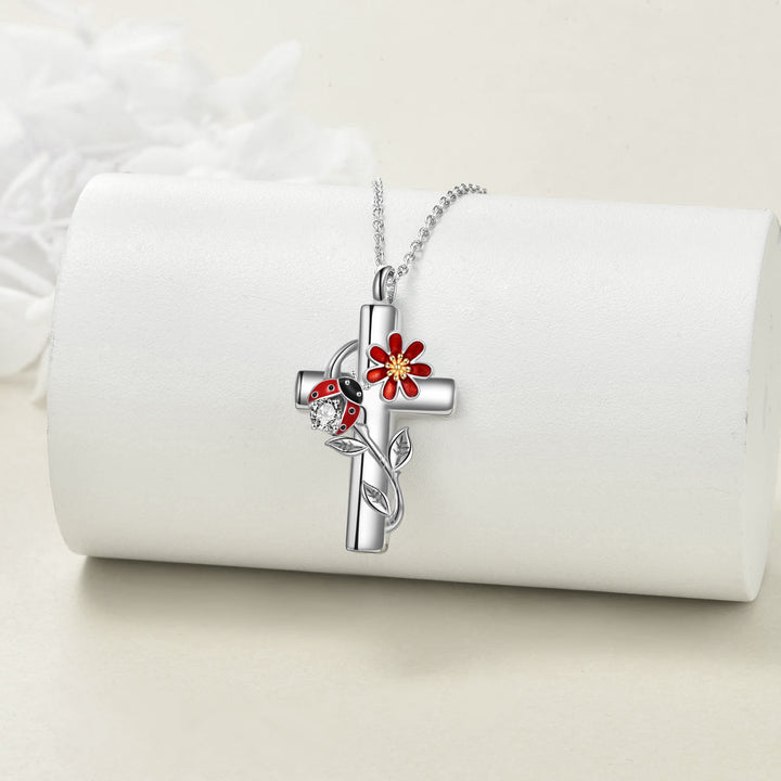 Sterling Silver Two-tone Circular Shaped Cubic Zirconia Ladybug & Cross Urn Necklace for Ashes with Engraved Word