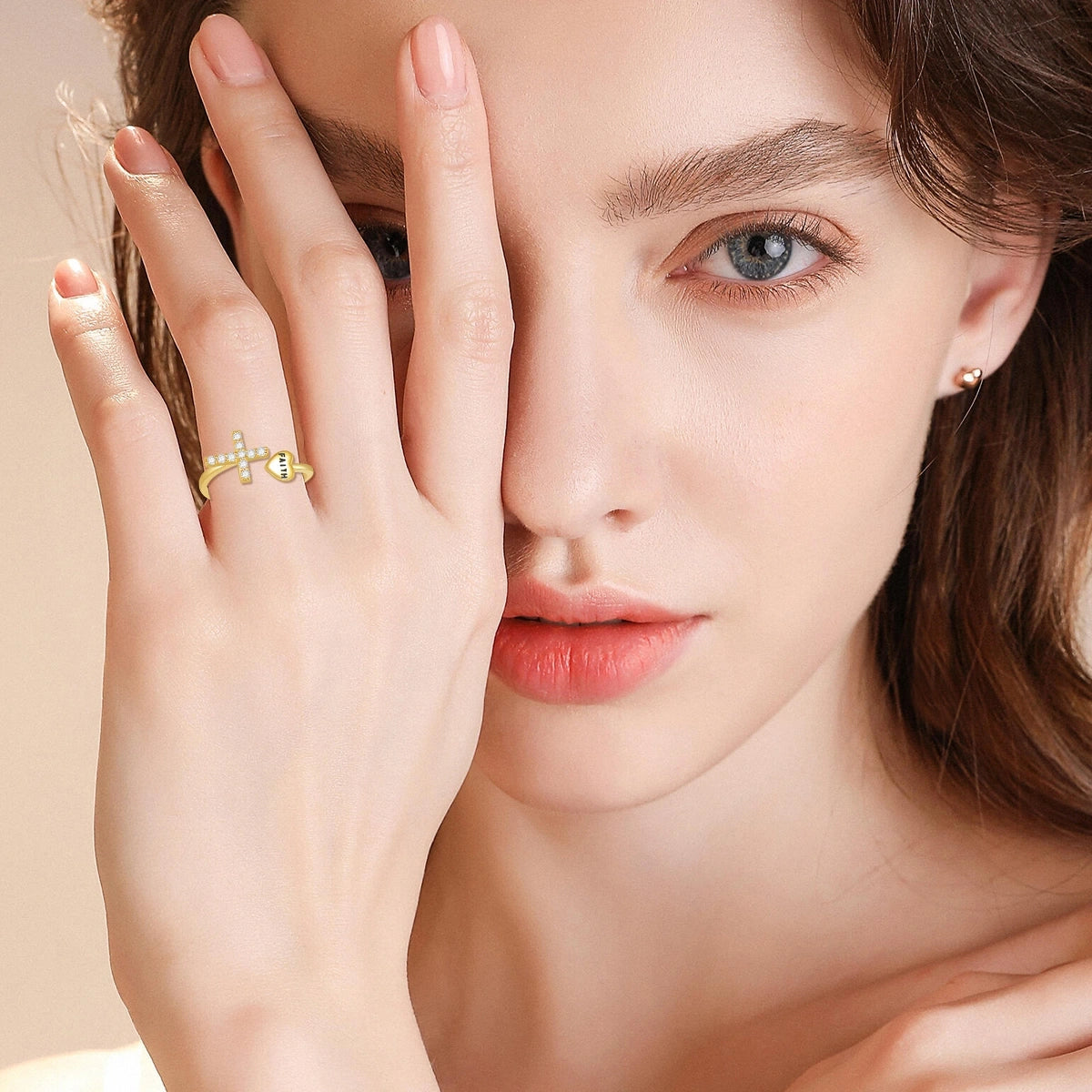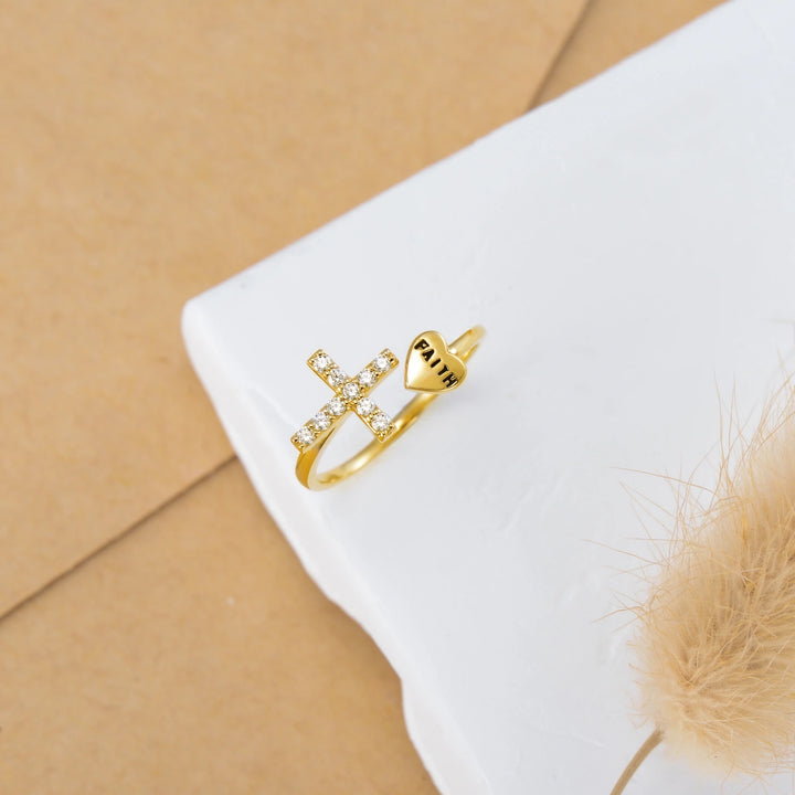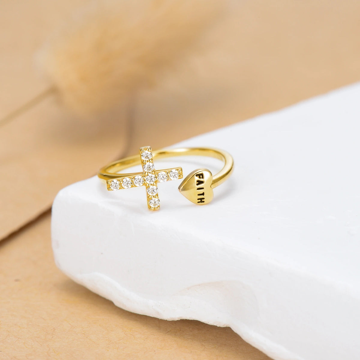 14K Gold Cubic Zirconia Cross & Heart Open Ring with Engraved Word