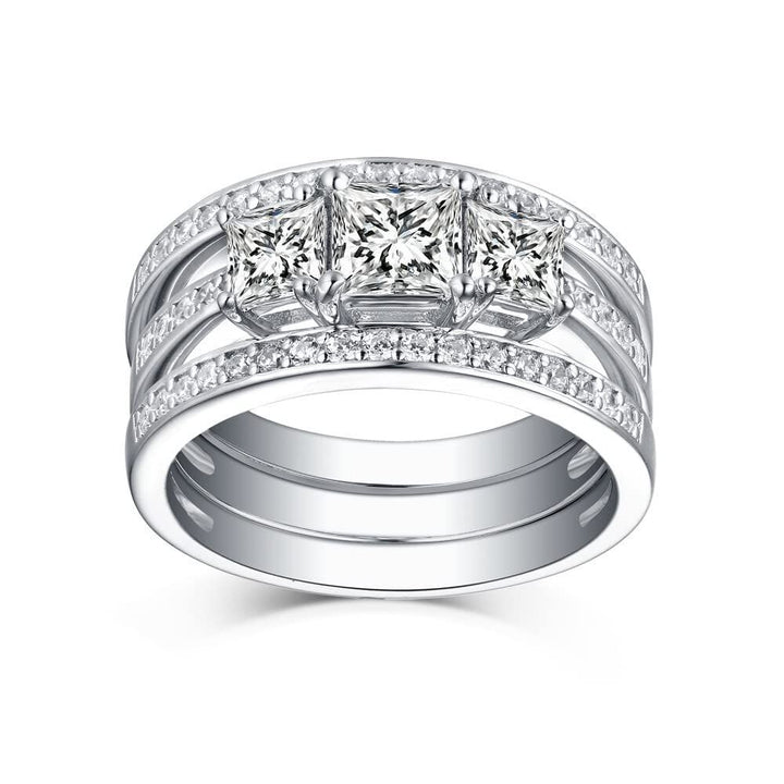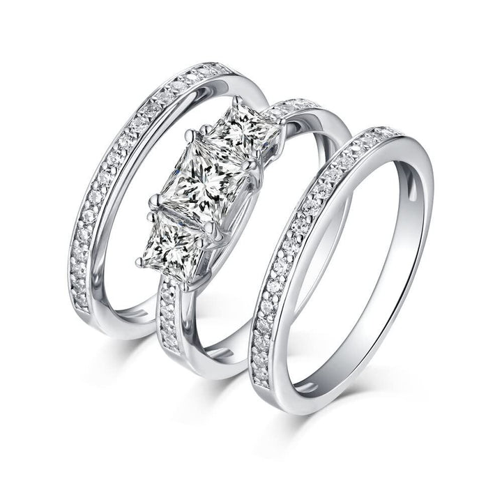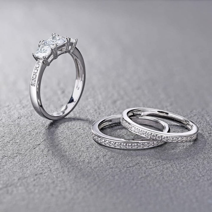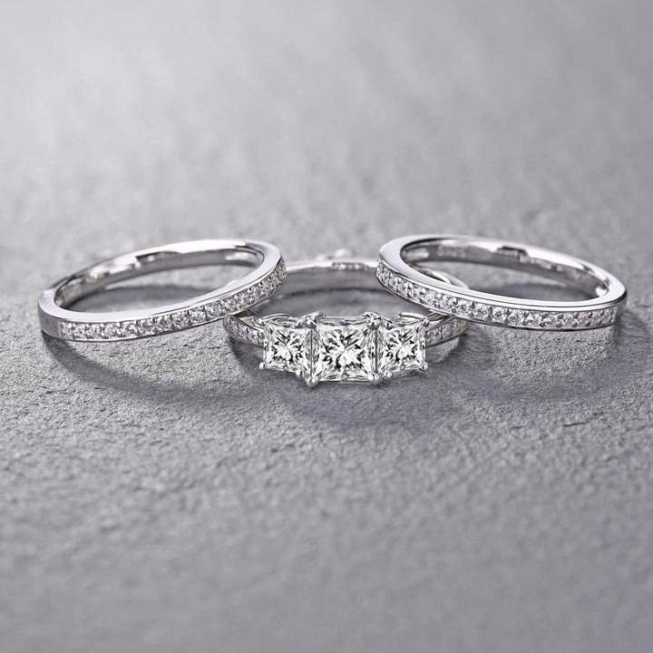 Crafted from 14K White Gold, featuring a Bridal Set with a 1 CT Princess Cut Moissanite Center Stone in a Three-Stone Design with EX polish, cut, and symmetry.