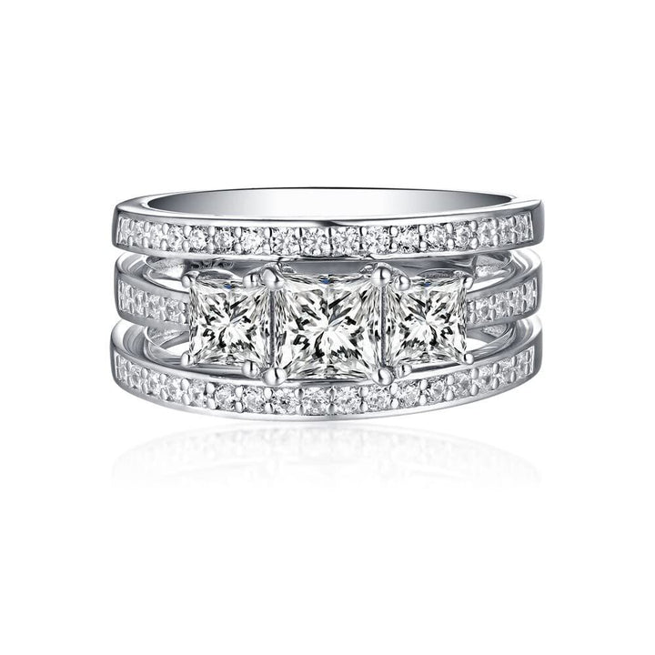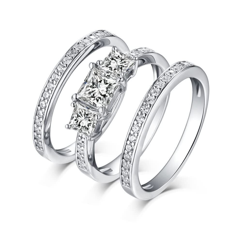 This Princess Cut Moissanite Bridal Set by YFN is an exquisite unisex Bridal Set that epitomizes elegance and brilliance. Crafted from premium 14K White Gold, it features a stunning three-stone design with a captivating 1 CT Princess Cut Moissanite center stone. Boasting exceptional polish, cut, and symmetry, this set combines the durability of Moissanite with a sophisticated aesthetic, making it a timeless symbol of commitment for couples.