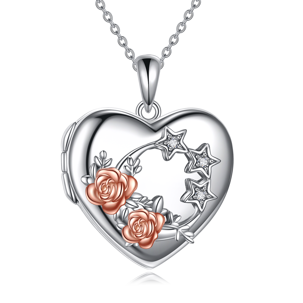 Sterling Silver Zircon Star With Rose Personalized Photo Locket Necklace For Women
