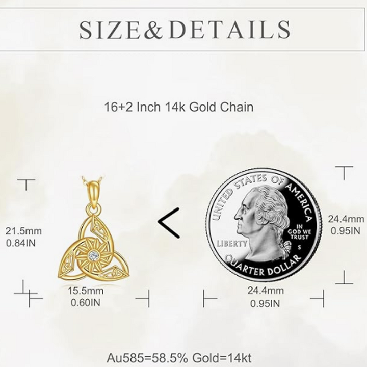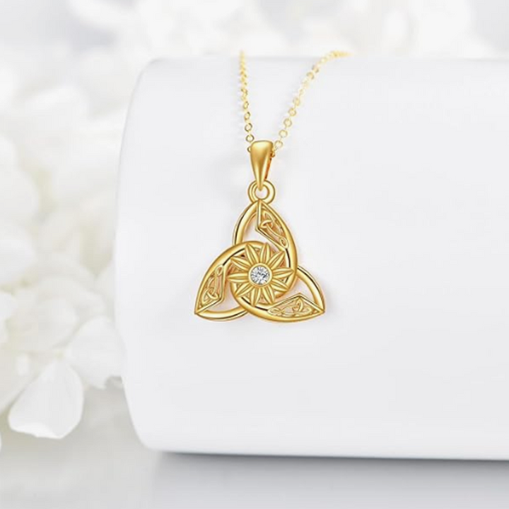 This pendant necklace is crafted from 14K solid Gold. It features Cubic Zirconia stones, and wildflowers, Celtic Knot, and Celtic Spiral Knot motifs. It is customizable with a personalized birthstone.