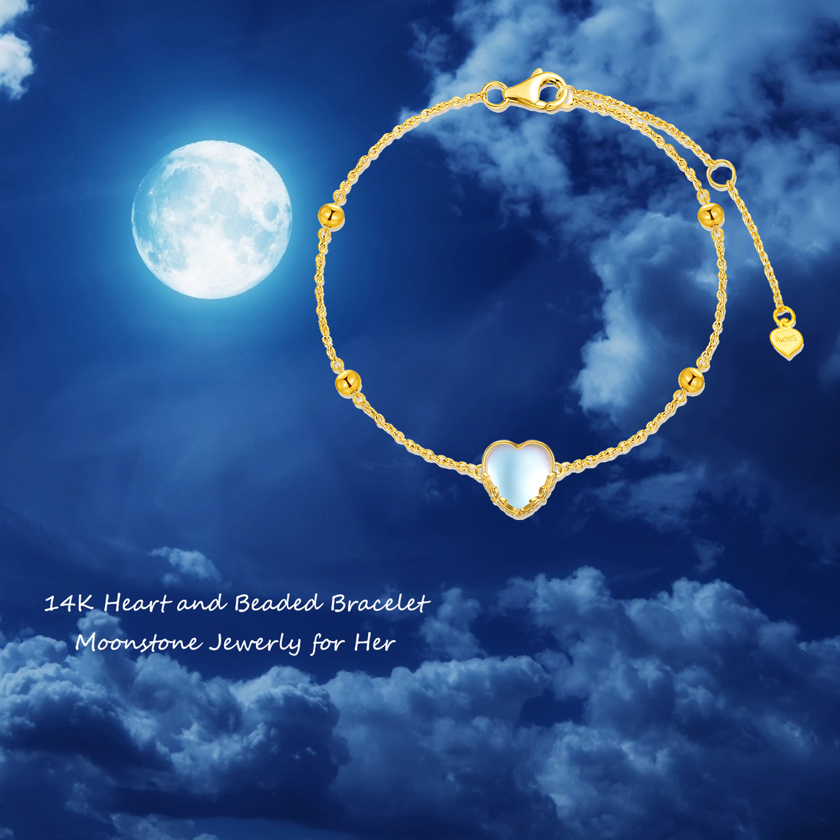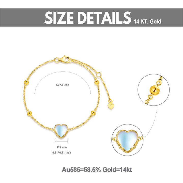 14K Gold Heart Moonstone Charm Bracelet For Women