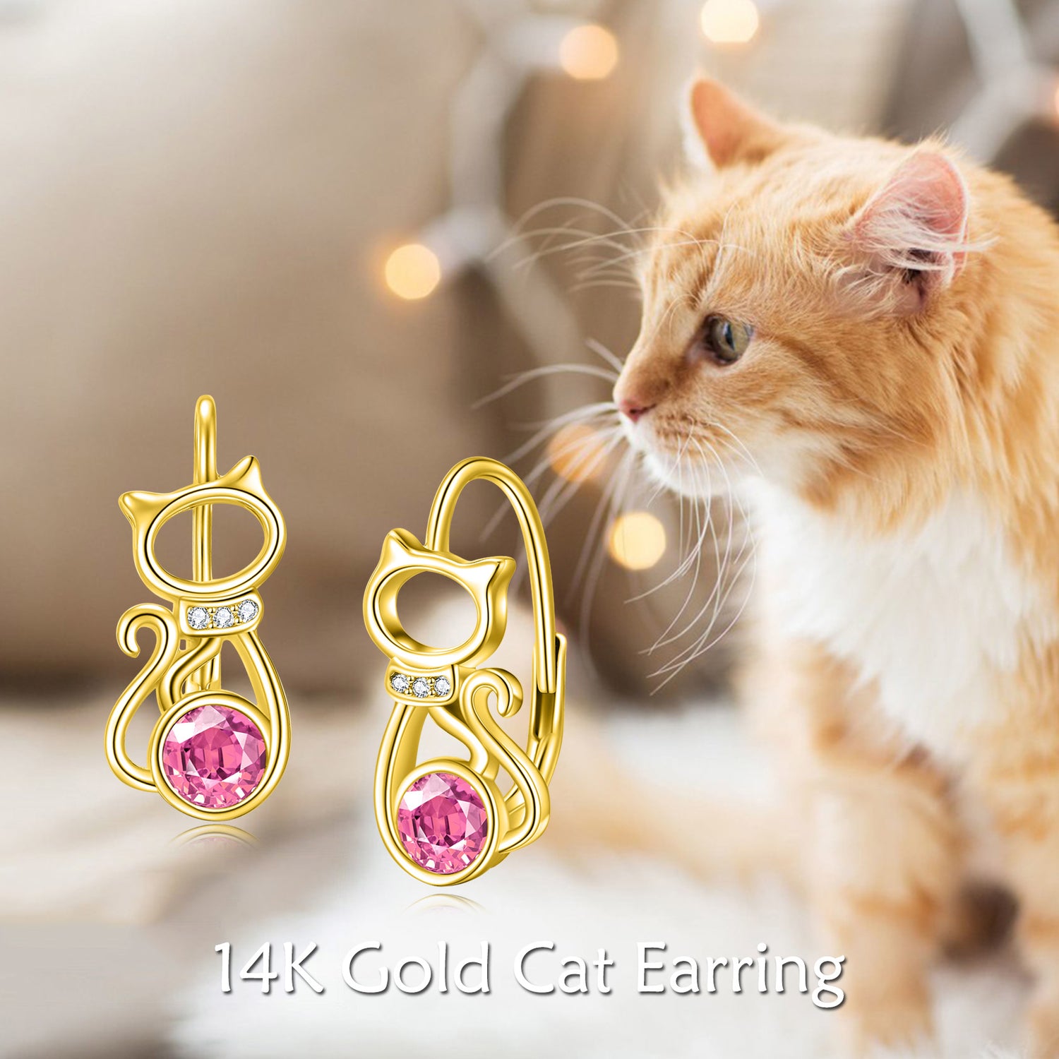 These Circular Lever-back Earrings are crafted from 14K Yellow Gold, Featuring Pink Crystals and a Charming Cat Motif.