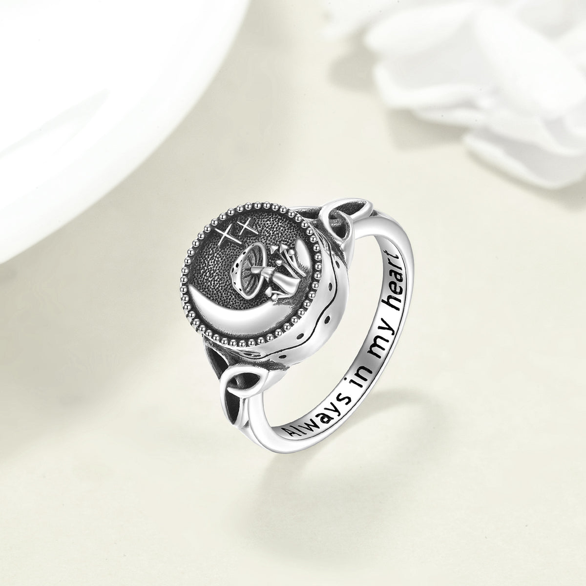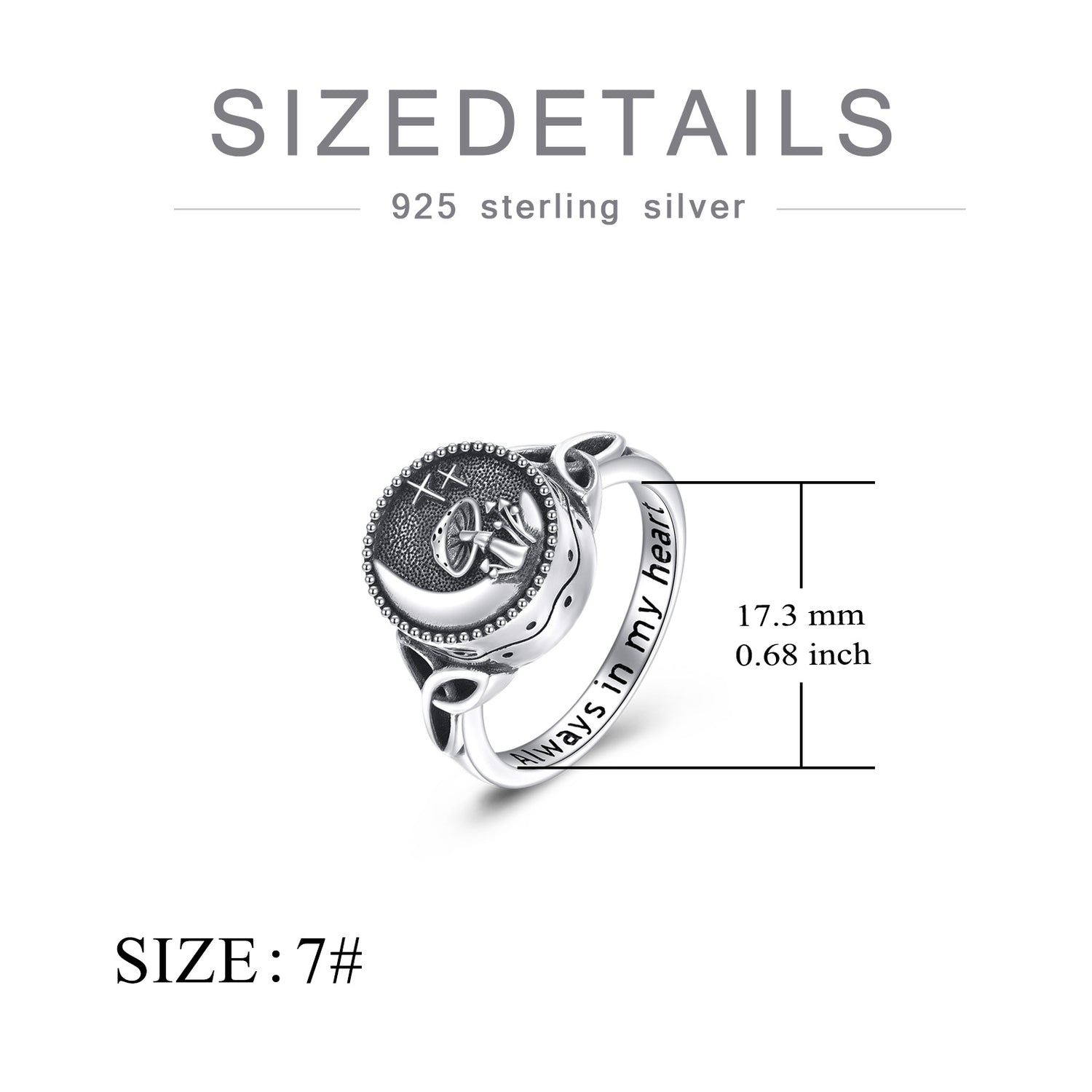 Crafted from Sterling Silver with a retro finish, featuring Celtic Knot, Mushroom, and Moon motifs. It is an Urn Ring with the engraved phrase "Always In My Heart."