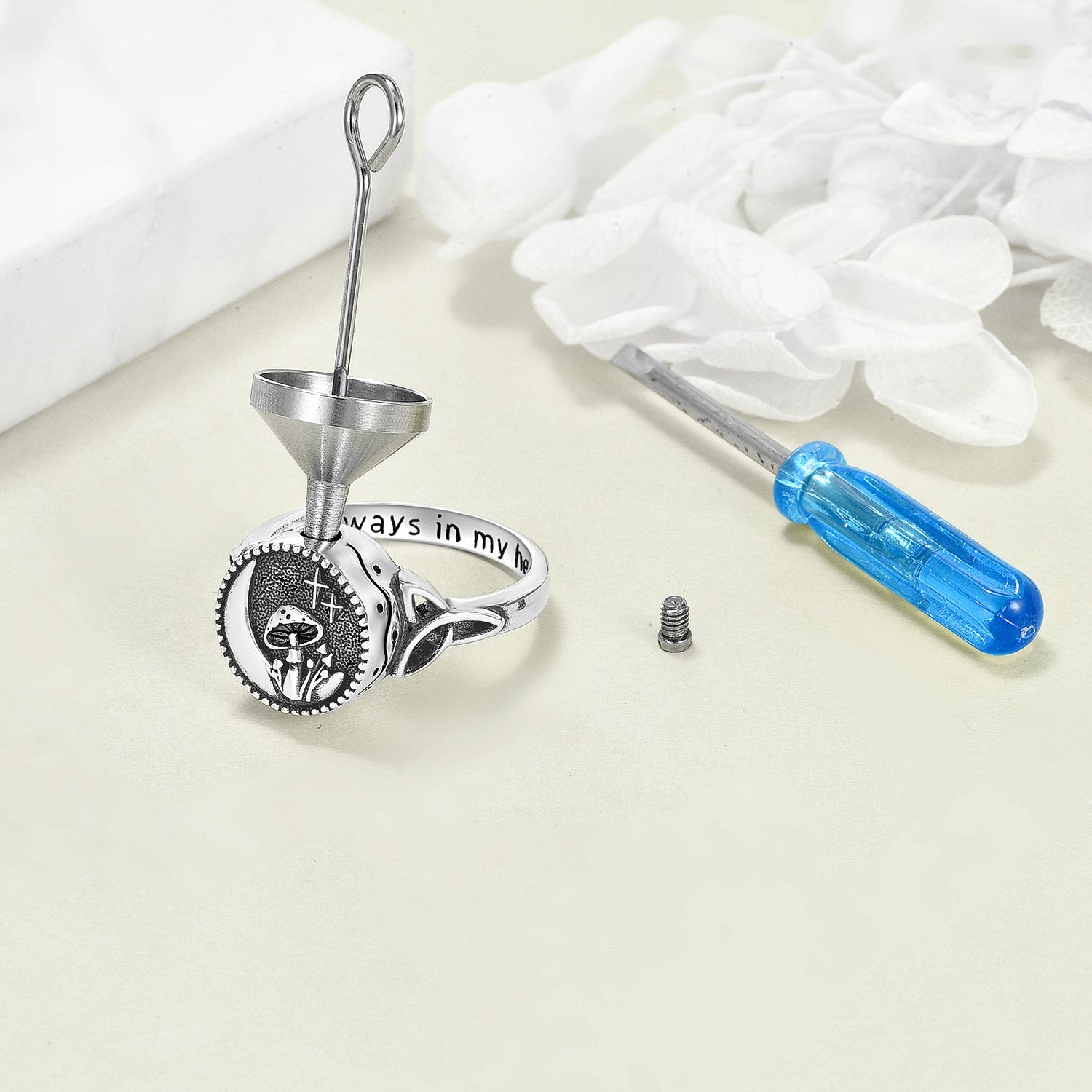This Mushroom Celtic Knot And Moon Urn Ring by YFN is a striking, retro-inspired piece that offers deep sentimental value. The high-quality sterling silver ring is intricately detailed with traditional Celtic knots, a whimsical mushroom motif, and a celestial moon symbol, creating a touch of antique mystique. Functioning as a heartfelt keepsake, it features a discreet chamber for ashes. With the comforting engraving, "Always In My Heart," this ring serves as a versatile and meaningful tribute.