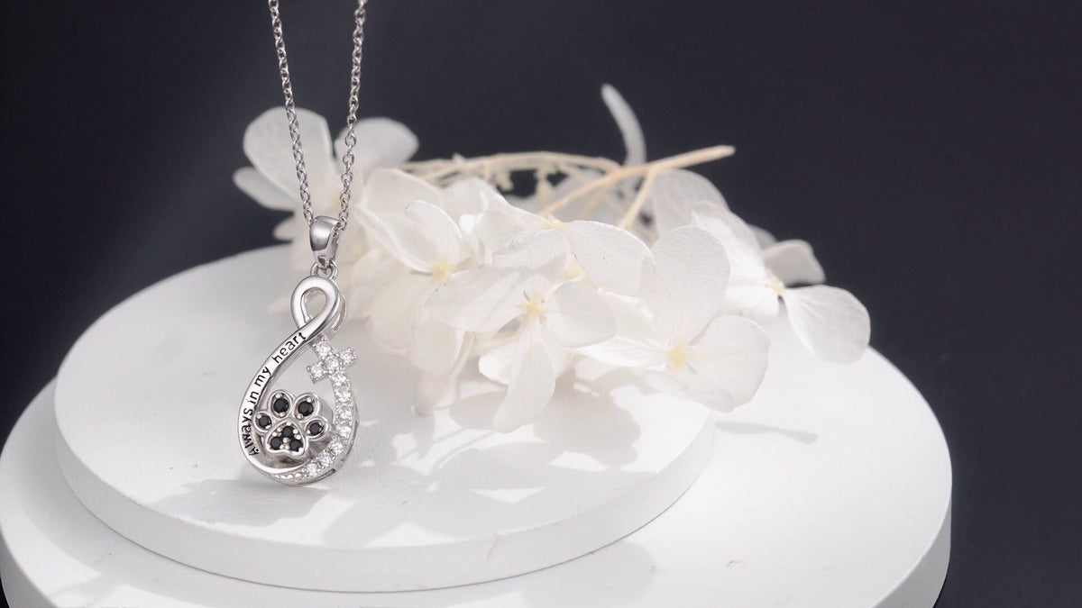 This Round Cubic Zirconia Paw With Cross Infinity Symbol Urn Necklace by YFN is a deeply sentimental keepsake. The round, white gold plated sterling silver urn is embellished with sparkling cubic zirconia and features meaningful symbols: a paw (beloved pet), cross, and infinity sign. Engraved with "Always In My Heart," it offers an elegant, cherished way for women to honor a memory.