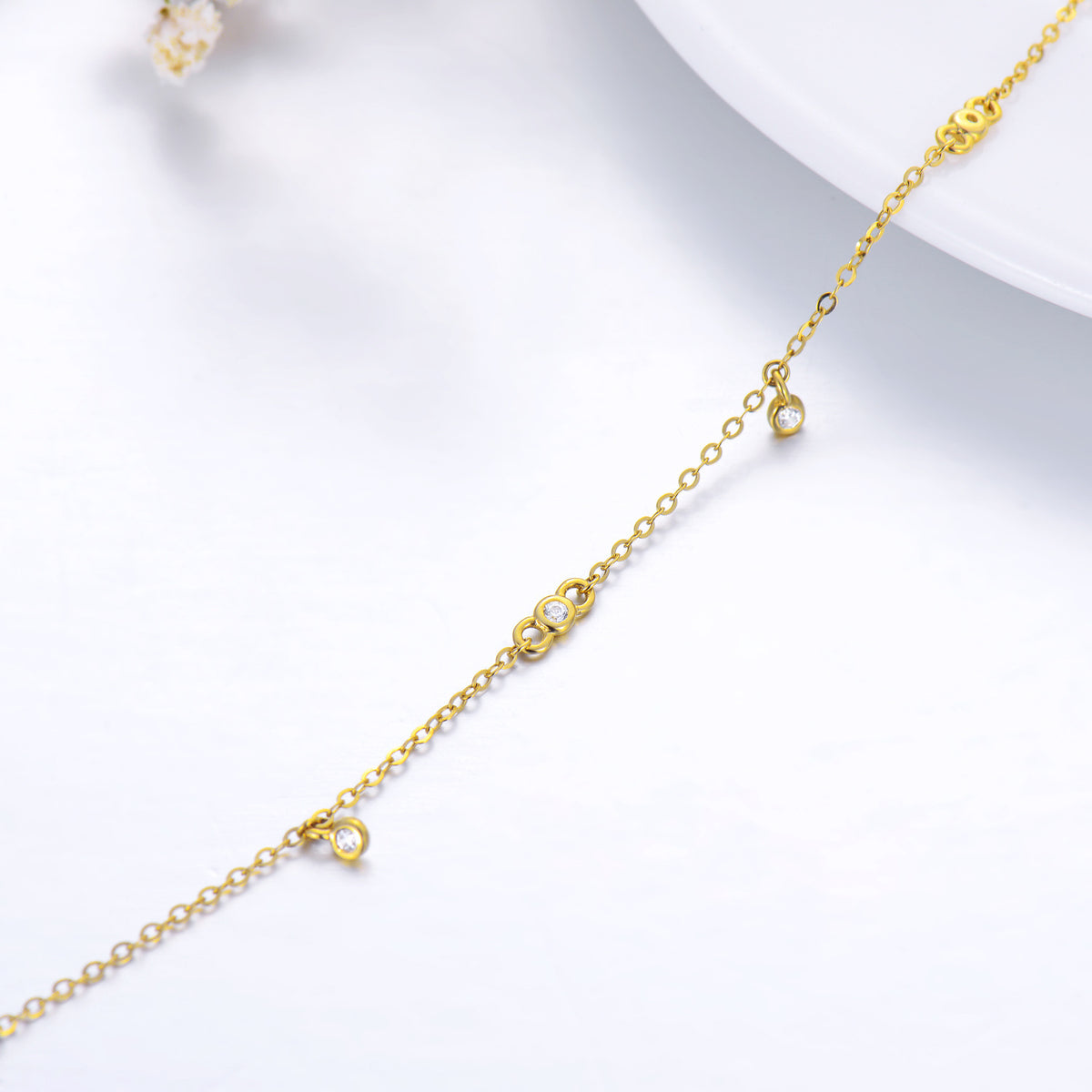This 14K Gold Circular Shaped Cubic Zirconia Charm Bracelet by YFN is an exquisite charm bracelet for women, offering luxury and sophistication. Crafted from high-quality 14K gold, the circular-shaped design is meticulously adorned with dazzling clear Cubic Zirconia stones, ensuring it catches the light beautifully and adds a sparkling touch to any style.