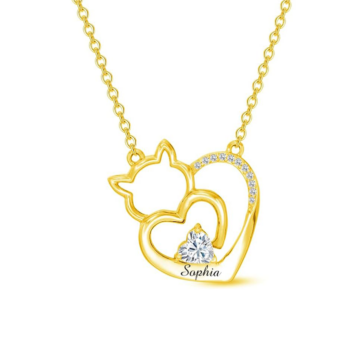 Crafted from 14K solid gold (stamped "AU585", 58.3% pure gold). Features a cat pendant set with Cubic Zirconia. The heart pendant measures 23mm and comes with an 18-inch chain plus a 2-inch extender. Includes personalized name engraving.