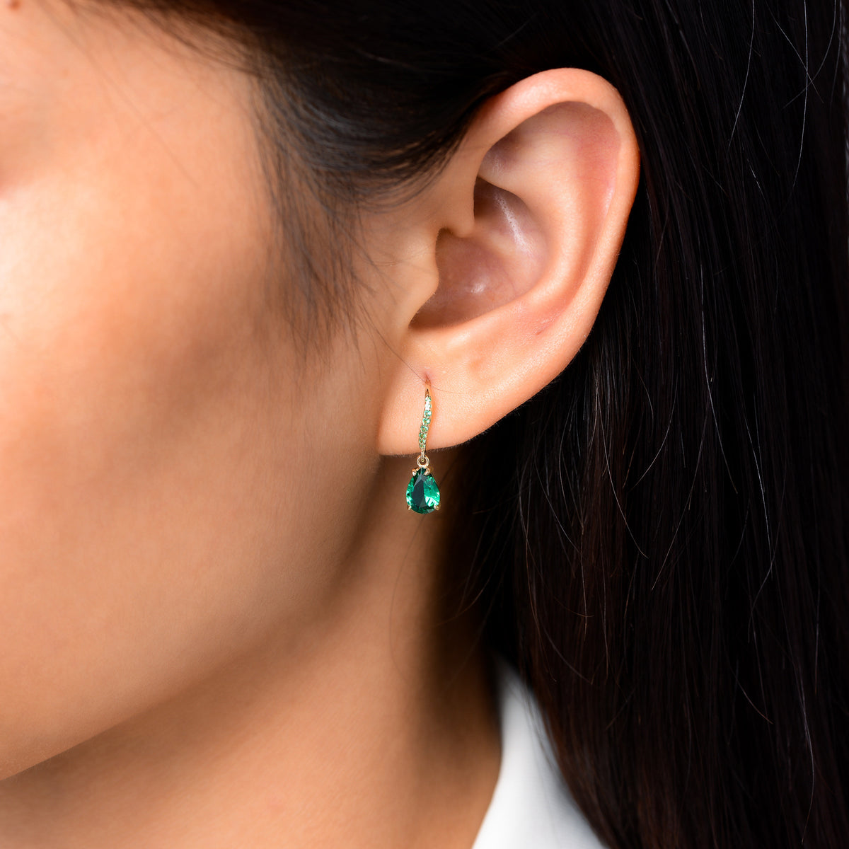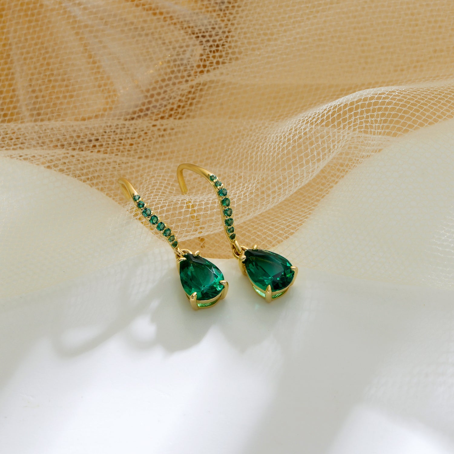 Handcrafted drop earrings made from 14K solid gold. Embellished with drop-shaped Cubic Zirconia and emerald-colored accents.