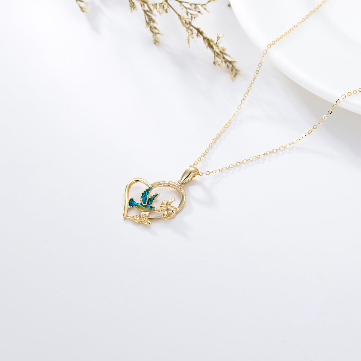 14K Gold Cubic Zirconia Hummingbird & Daffodil Heart Pendant Necklace