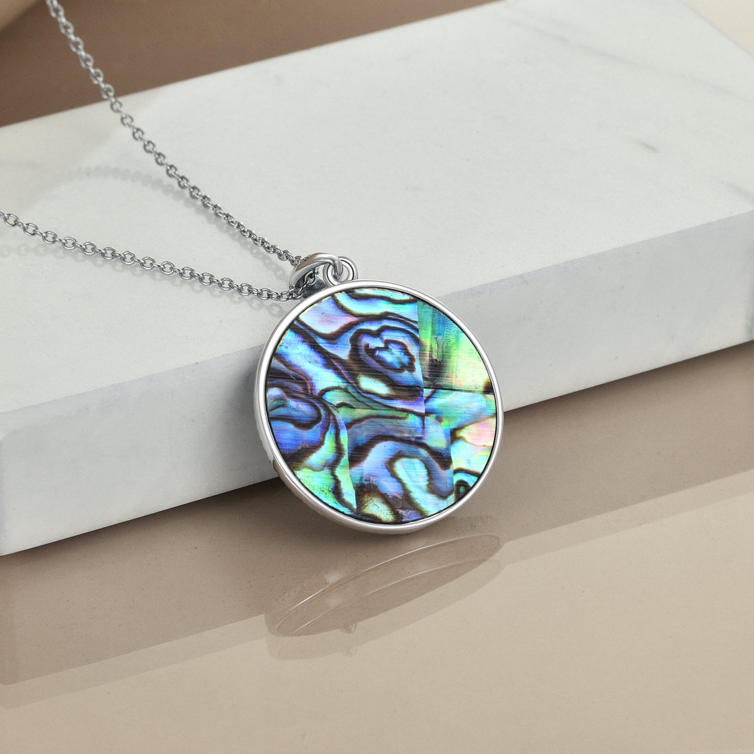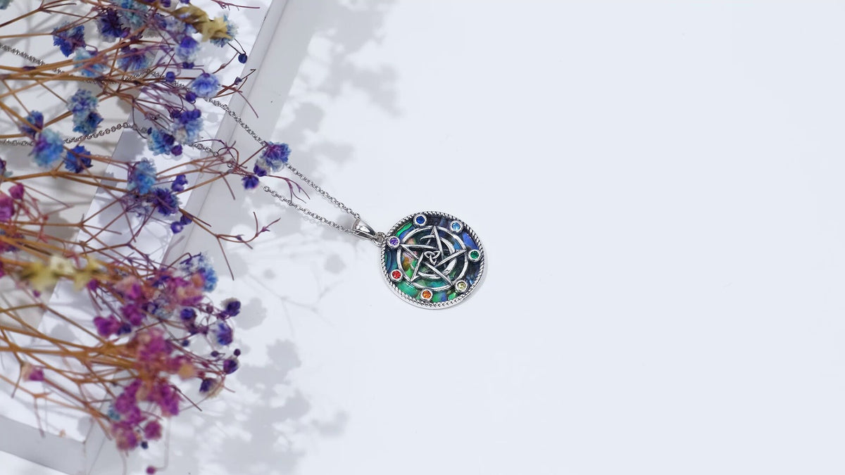 Crafted from Sterling Silver with White Gold Plating. This is a Pendant Necklace featuring Abalone Shellfish, Chakras, & Triple Moon Goddess motifs.