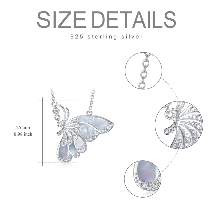 This Pendant Necklace is Crafted from Sterling Silver with White Gold Plating, featuring a Delicate Butterfly Design adorned with Exquisite Mother of Pearl Accents.