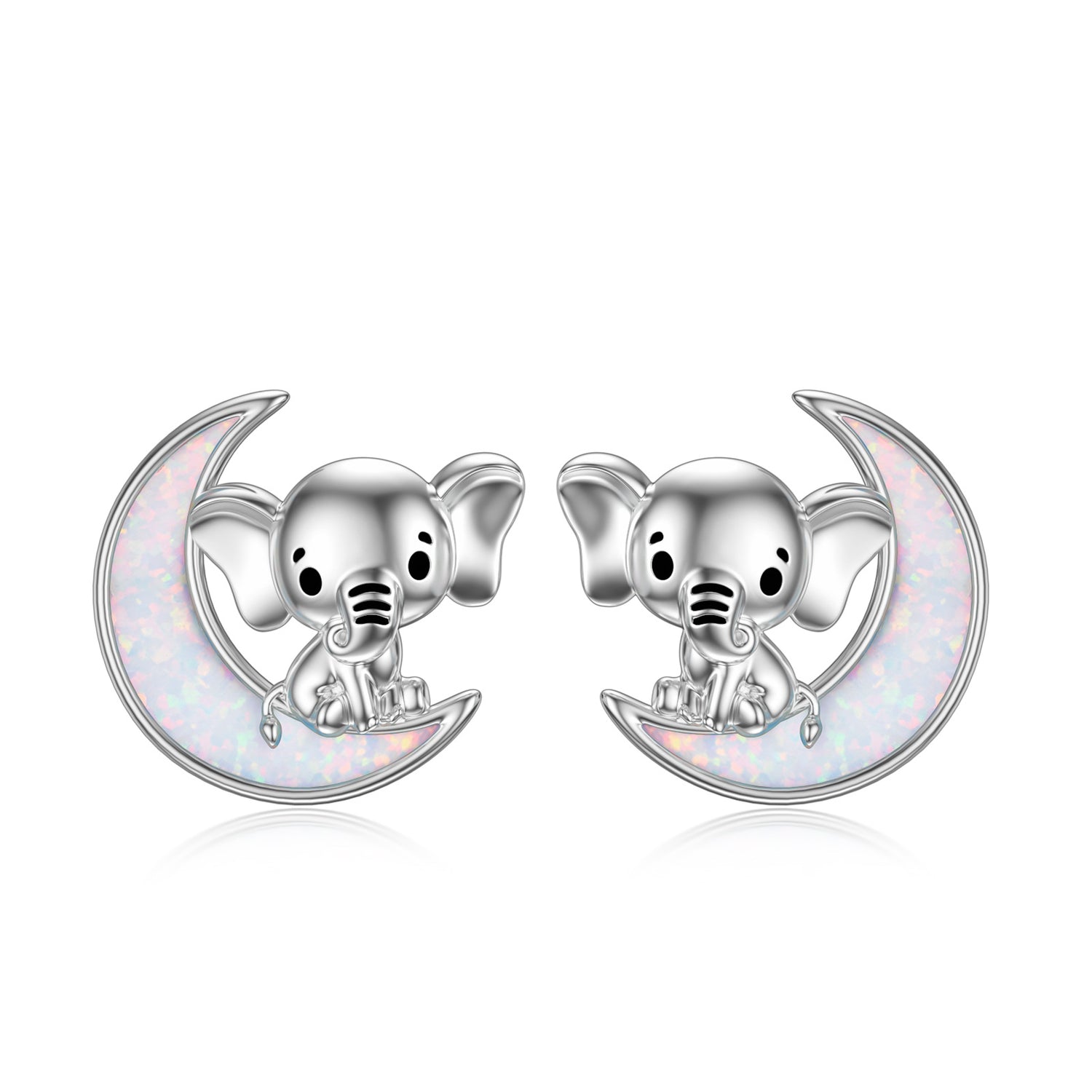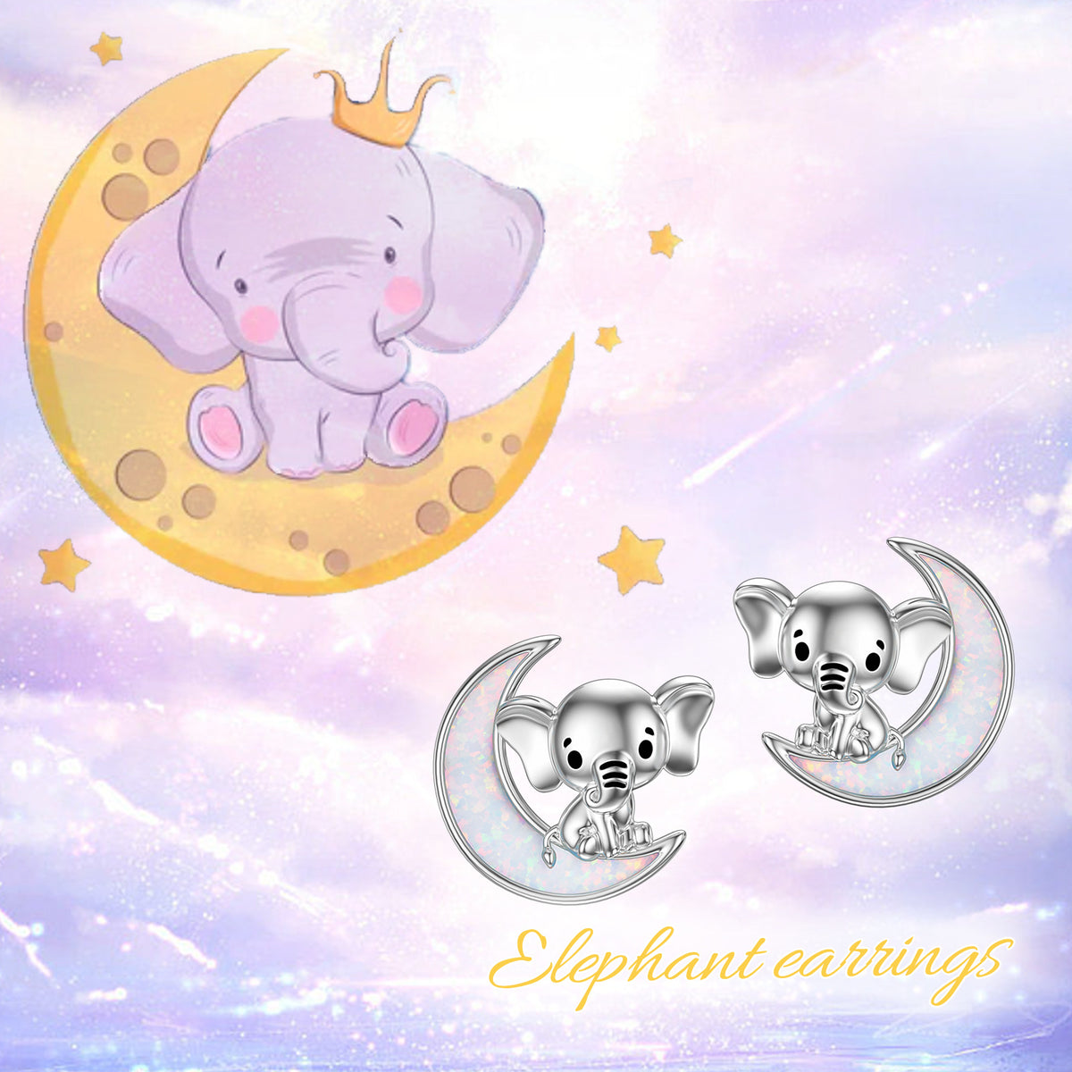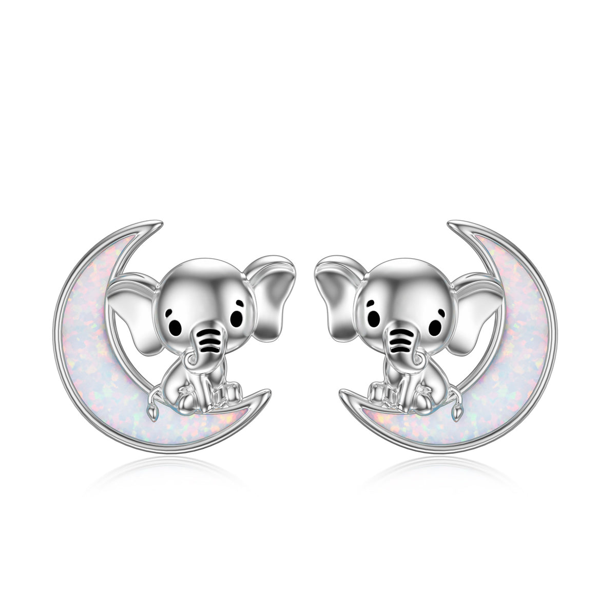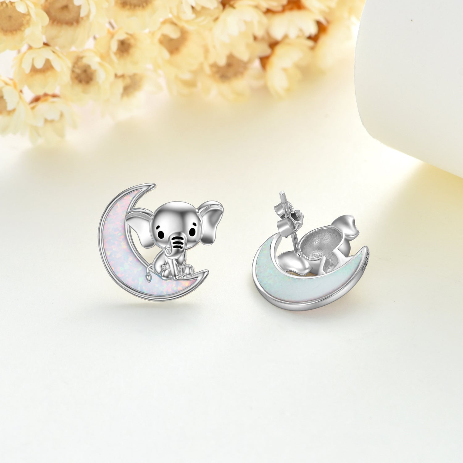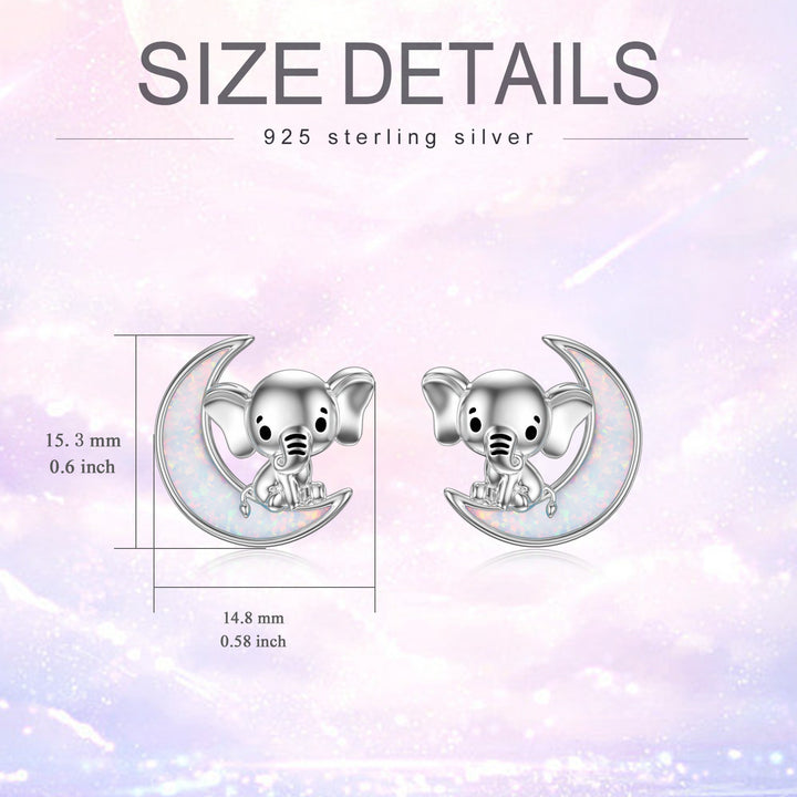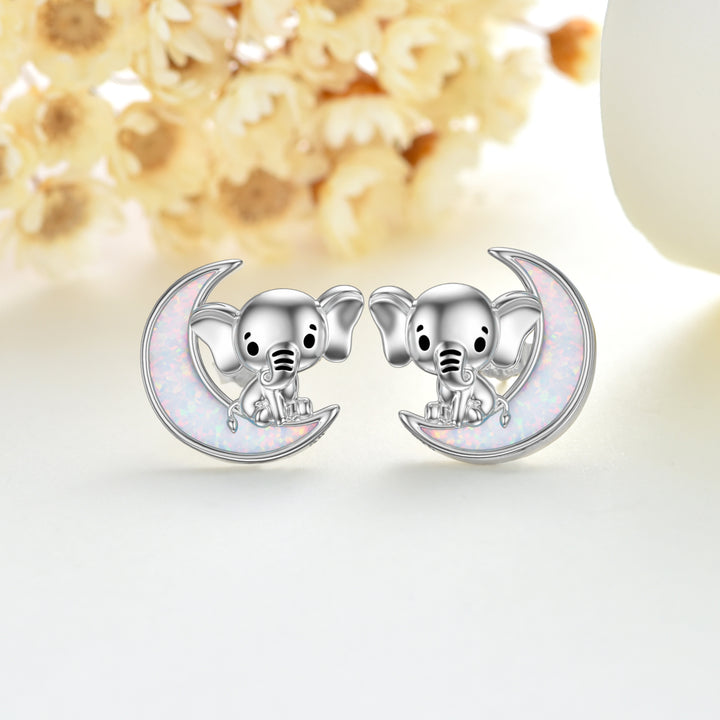 Sterling Silver Opal Elephant & Moon Stud Earrings