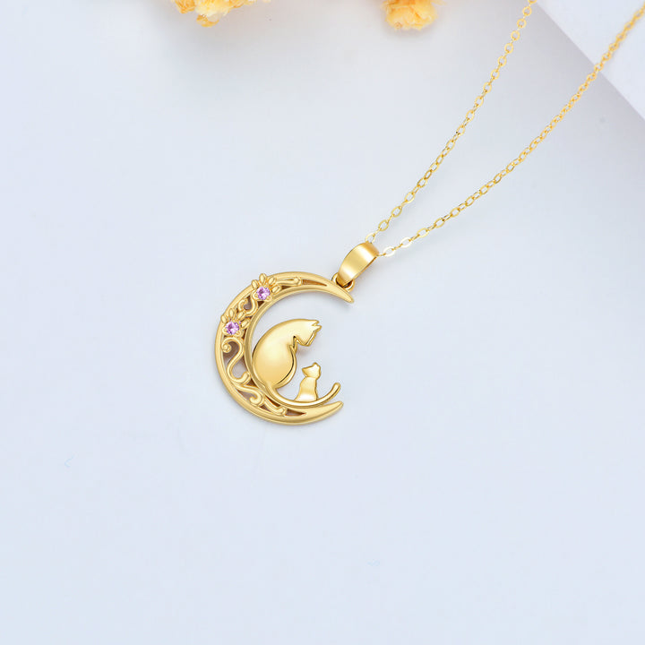 14K Gold Cubic Zirconia Cat Paw And Moon Pendant Necklace For Women