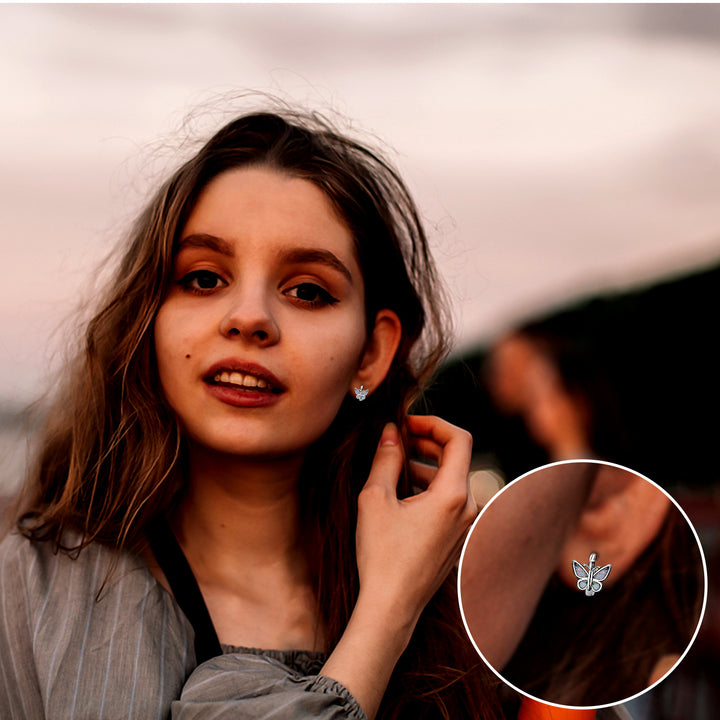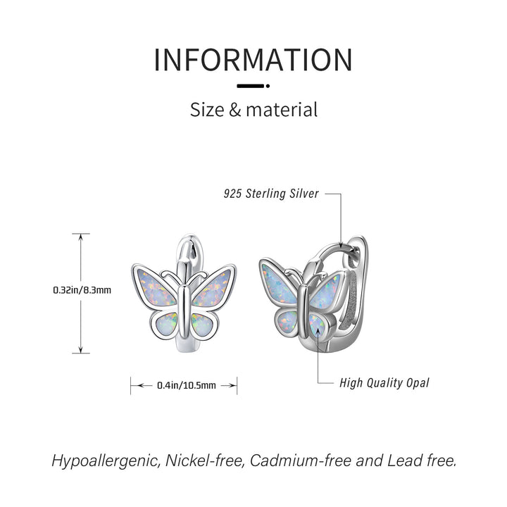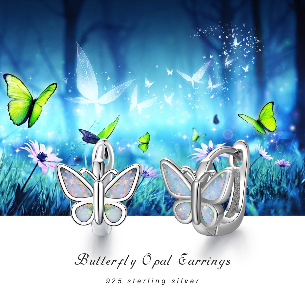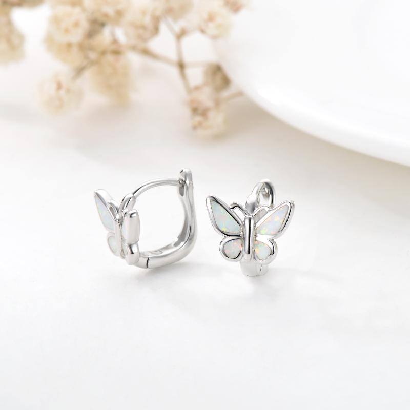 These hoop earrings are crafted from Solid 925 Sterling Silver, finished with White Gold Plating, and feature a delicate Butterfly motif set with white Opal gemstones.
