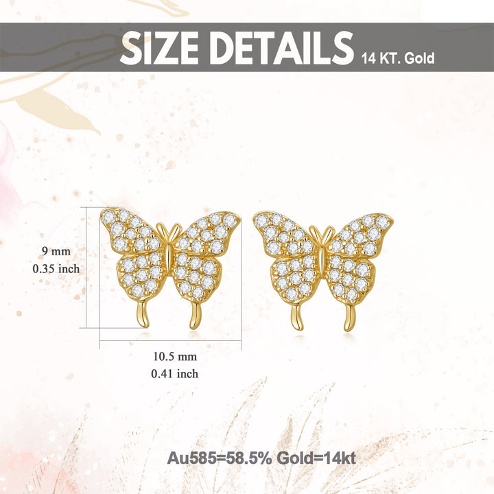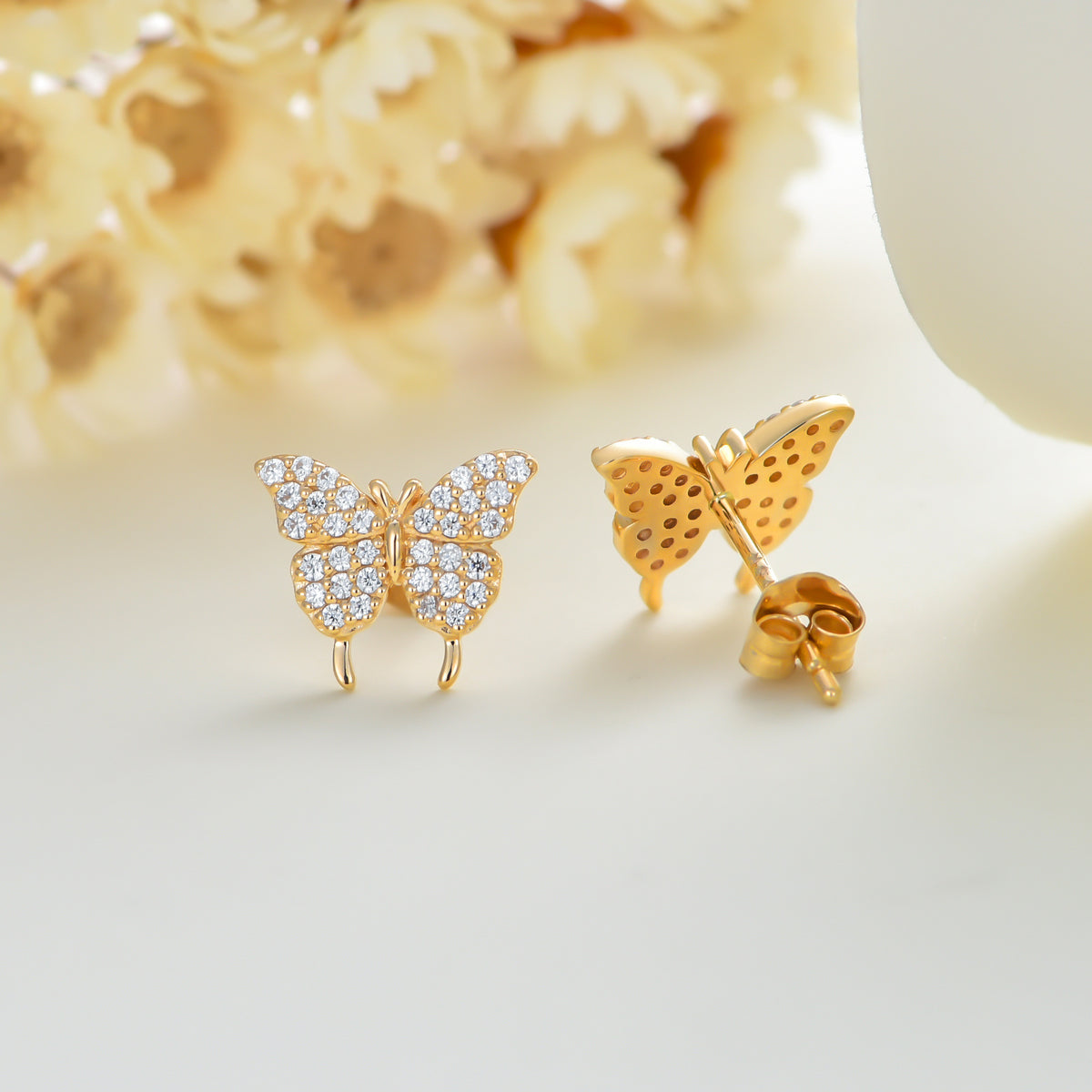 These Women's Stud Earrings are Crafted from Sterling Silver with Yellow Gold Plating, Featuring Round Cut Cubic Zirconia and a Butterfly Motif.