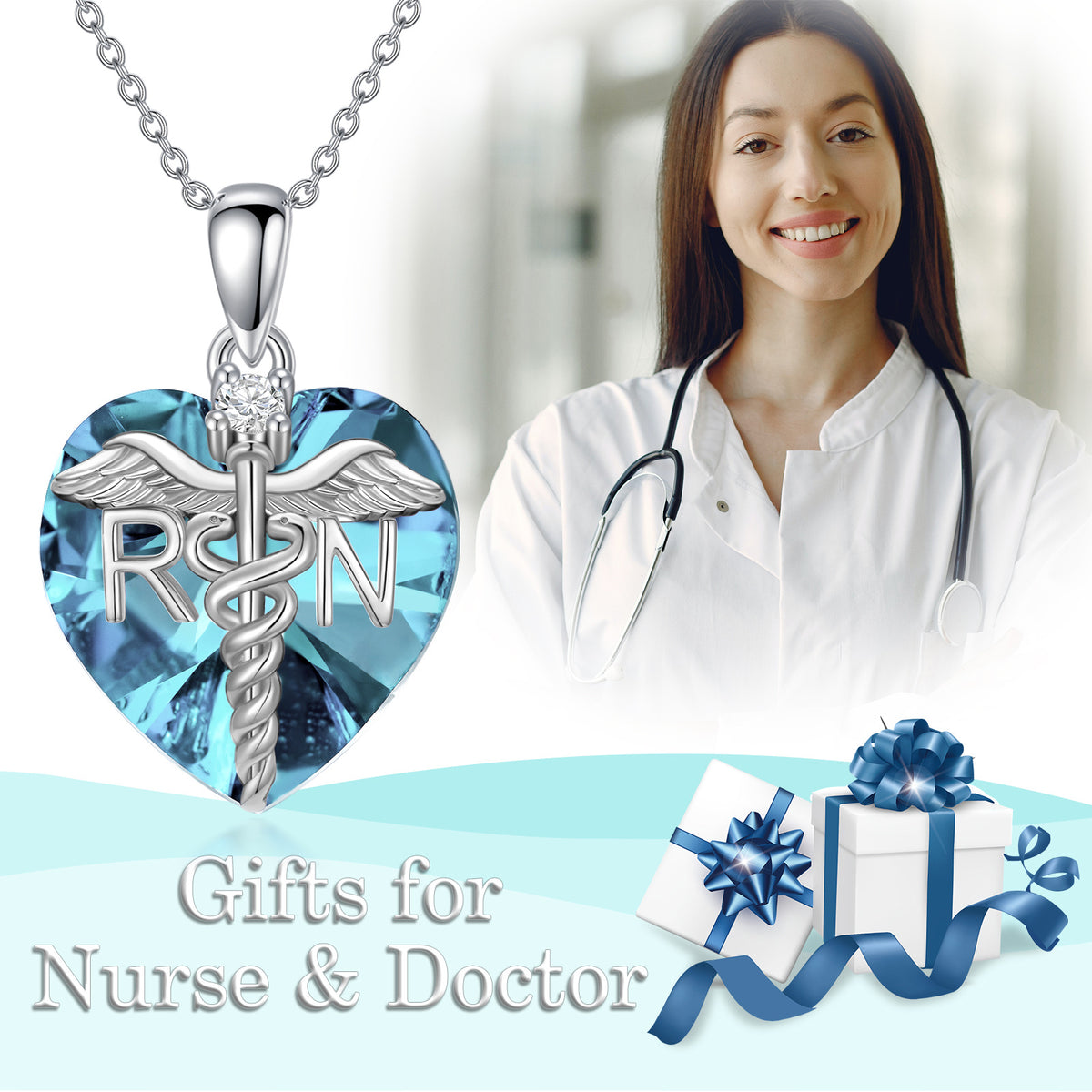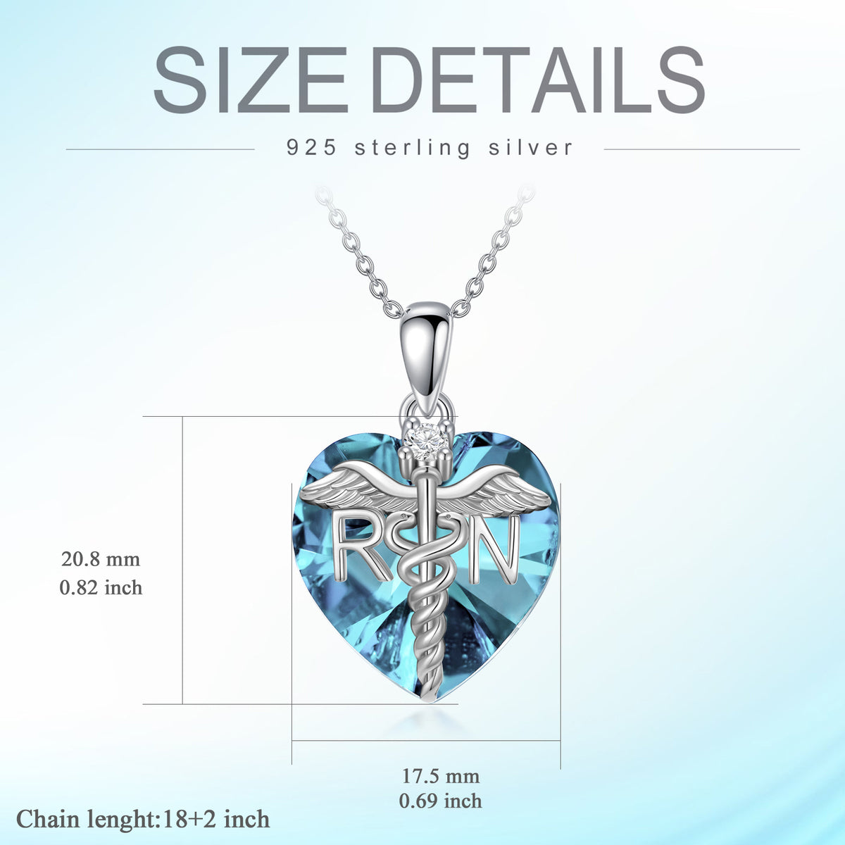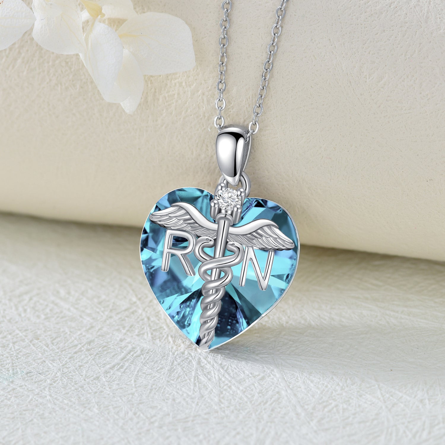Crafted from Sterling Silver with White Gold Plating. Features a Heart Shaped pendant adorned with Blue and White Crystals, and accented by Angel Wing and Caduceus symbols.