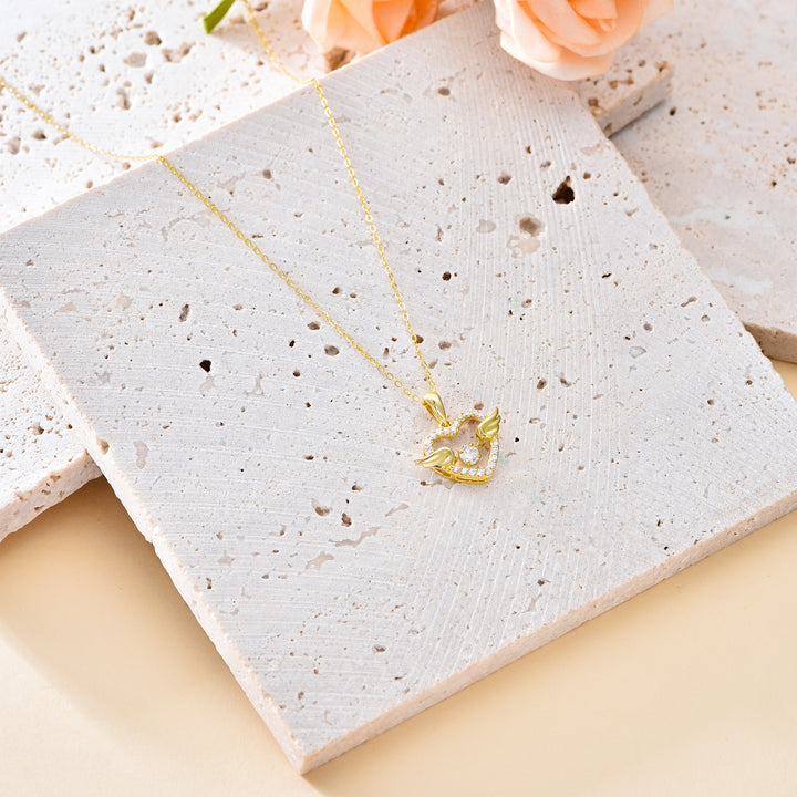 14K Gold Cubic Zirconia Angel Wing & Heart Pendant Necklace