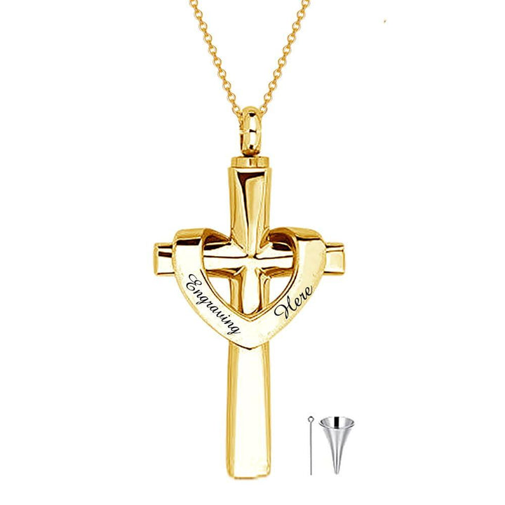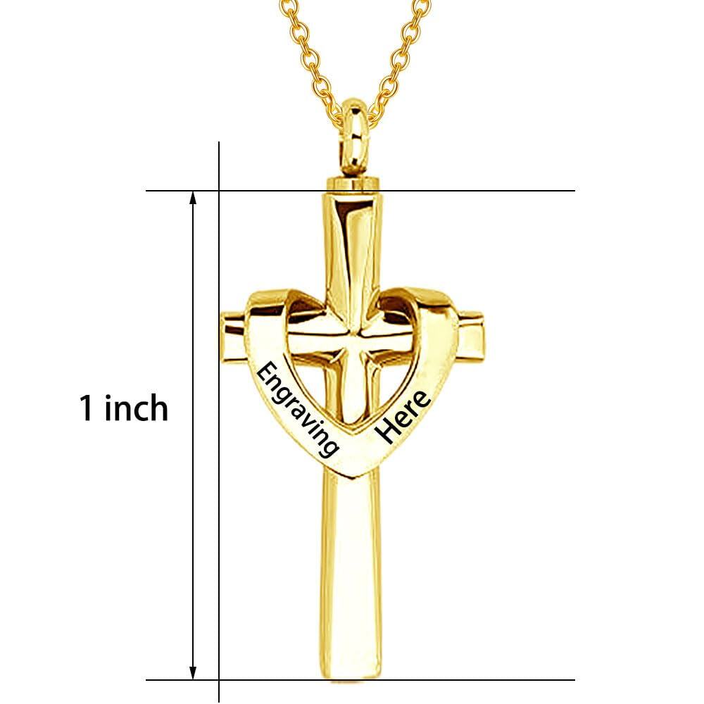 10K Yellow Gold Personalized Engraving Cross Heart Urn Cremation Necklace for Ashes