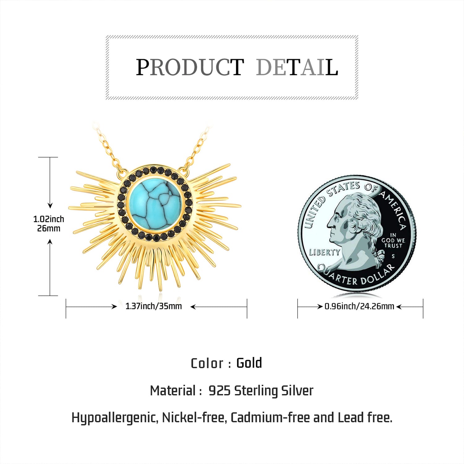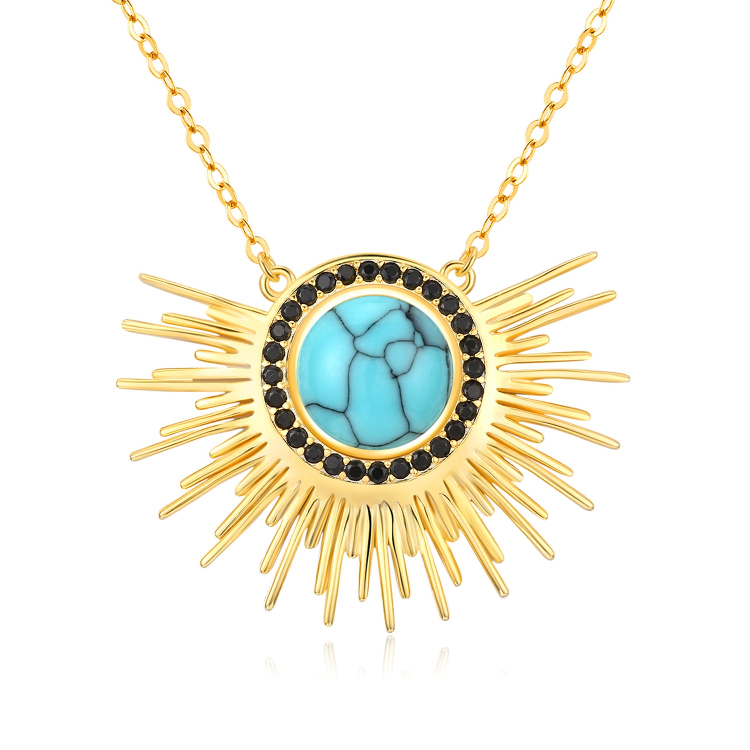 Crafted from Sterling Silver with Yellow Gold Plating. This is a Circular Shaped Pendant Necklace featuring a Sun motif, set with Turquoise stone.