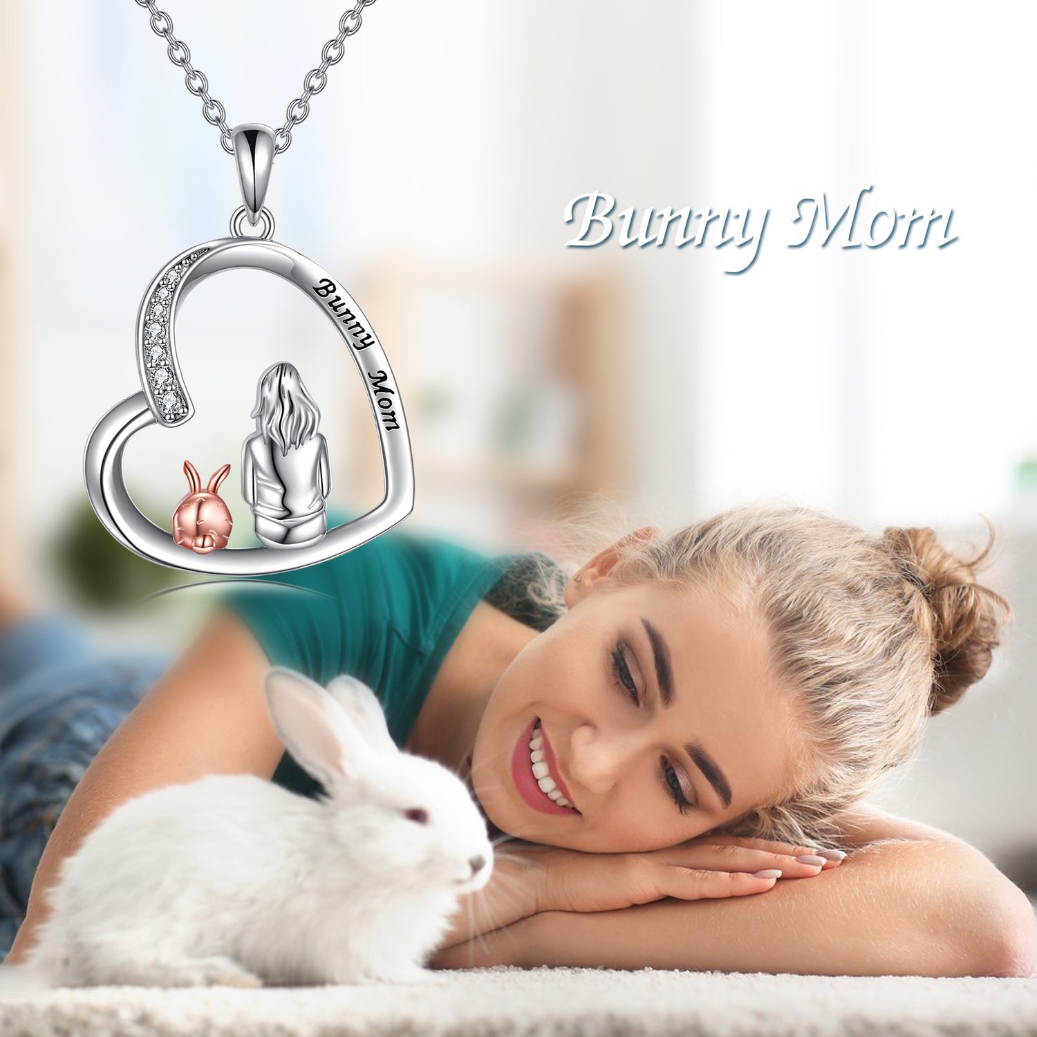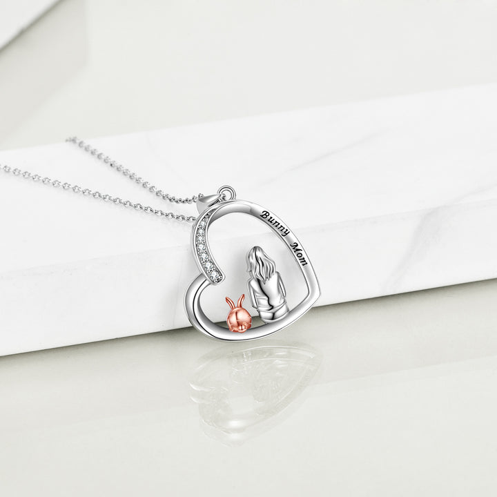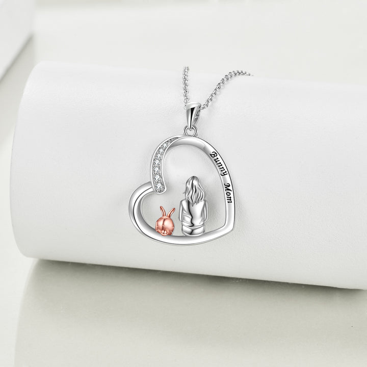 Sterling Silver Two-tone Round Zircon Rabbit Pendant Necklace with Engraved Word