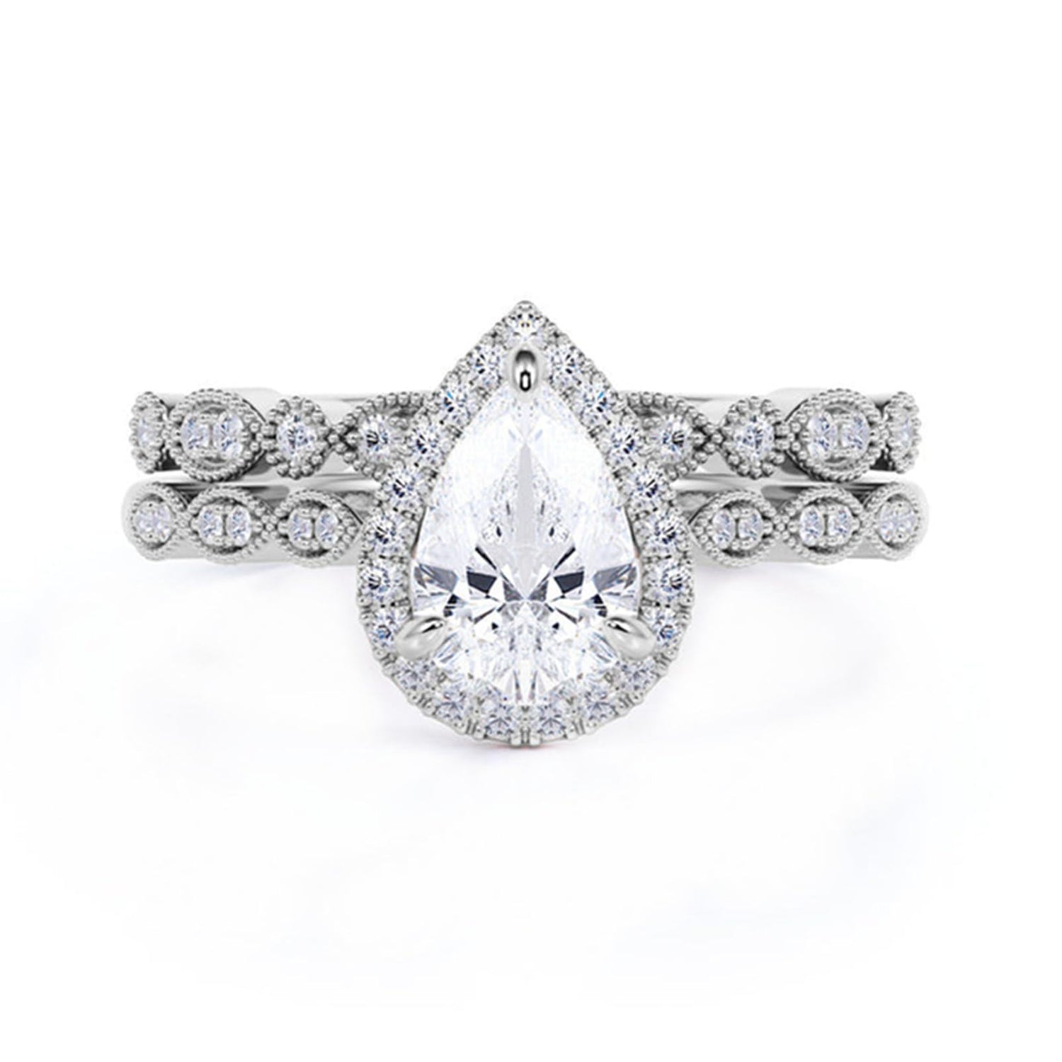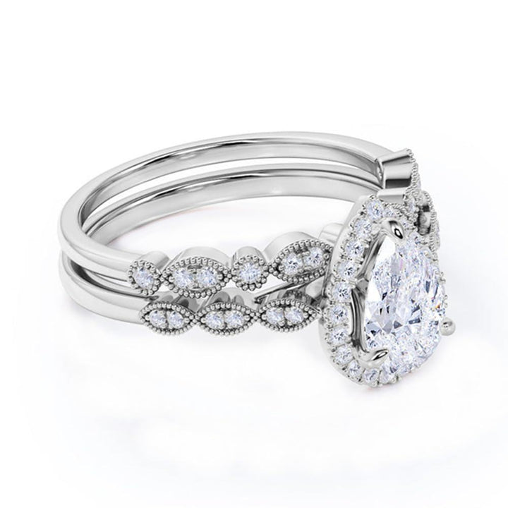 18K white gold bridal set featuring a 1-carat pear-cut moissanite center stone with coordinating wedding band. Available in sizes 4–12. Hypoallergenic and nickel-free.