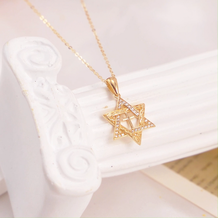 This 14K Yellow Gold Circular Cubic Zirconia Star Of David Pendant Necklace by YFN is a stunning circular-shaped necklace for women, adding elegance and spiritual significance. Crafted from high-quality 14K Gold, the pendant is adorned with a Clear Cubic Zirconia Star Of David. The brilliant sparkle enhances its beauty, making it a versatile piece for all occasions.