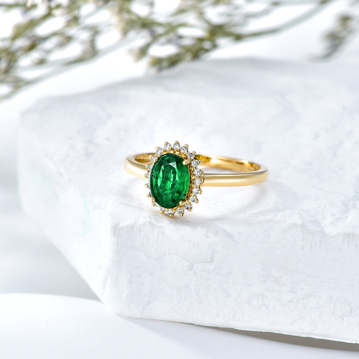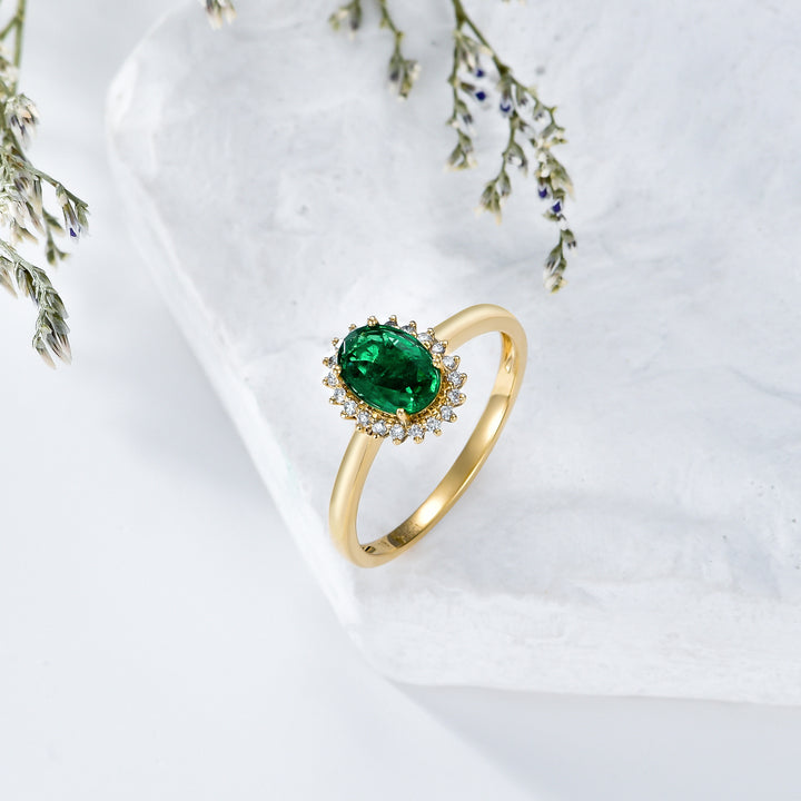 Crafted in 18K gold with oval emerald center stone (2–7 CT). Halo-style setting. Polished band design.