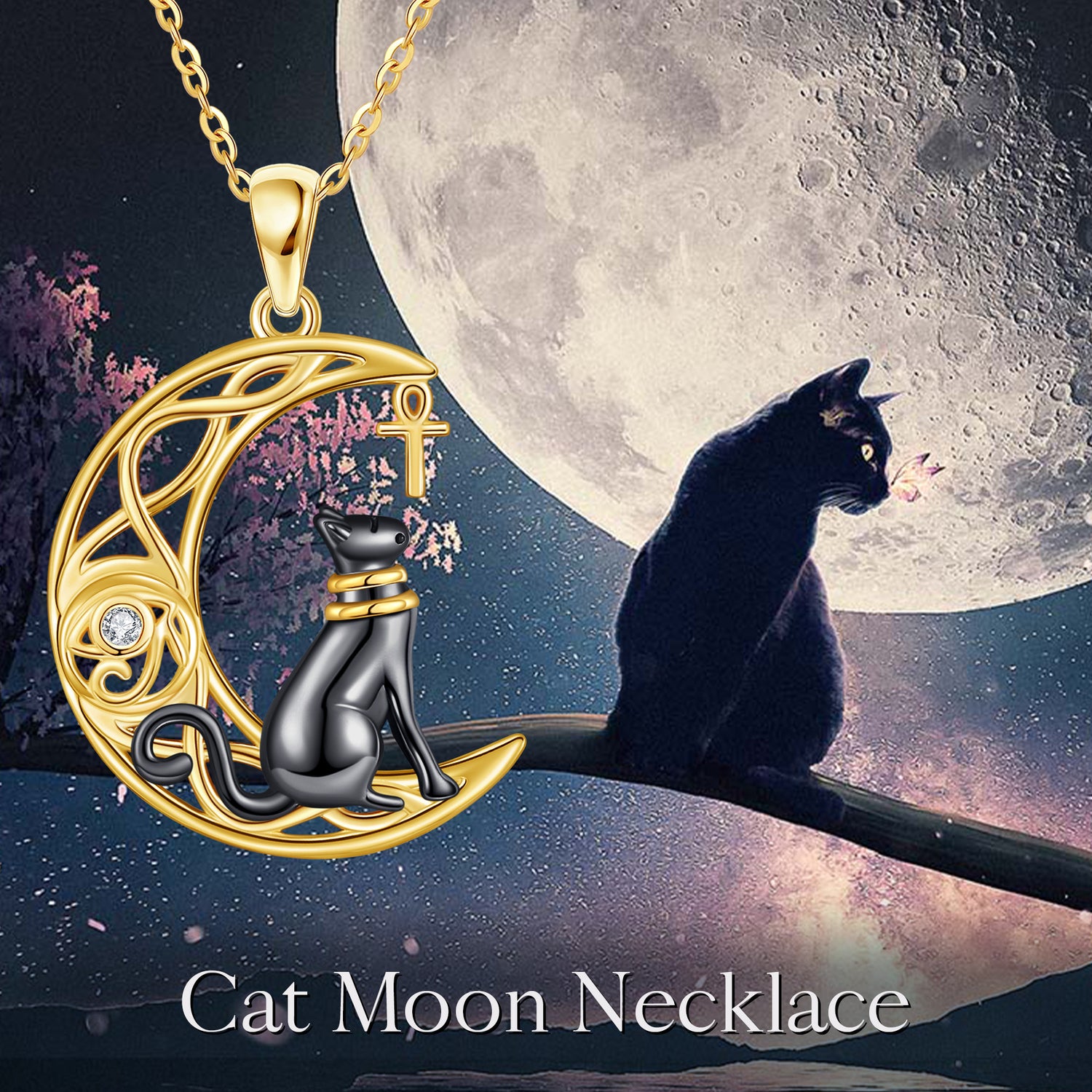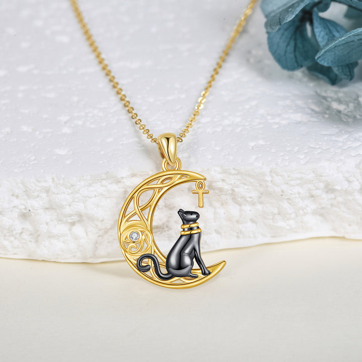 14K Yellow Gold Circular Cubic Zirconia Cat & Celtic Knot With Moon Pendant Necklace For Women