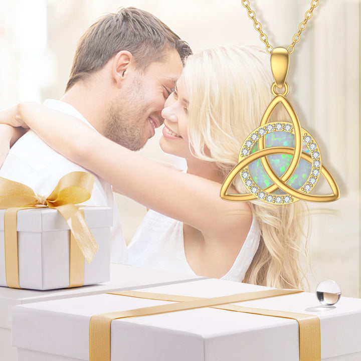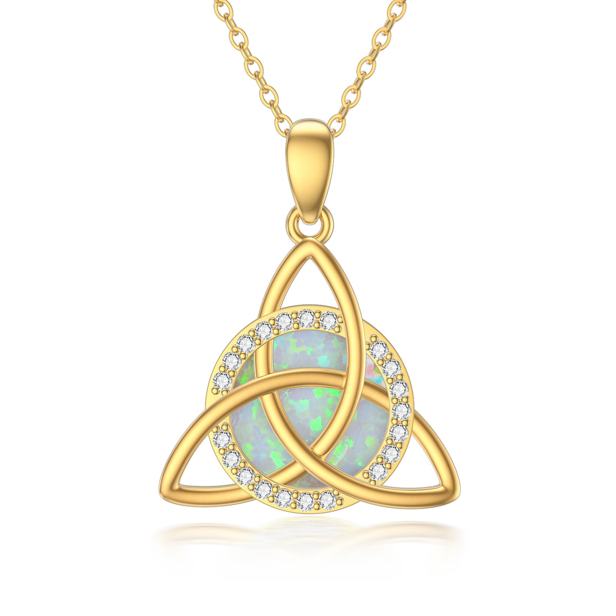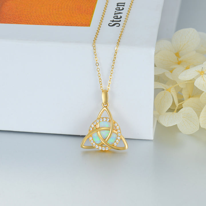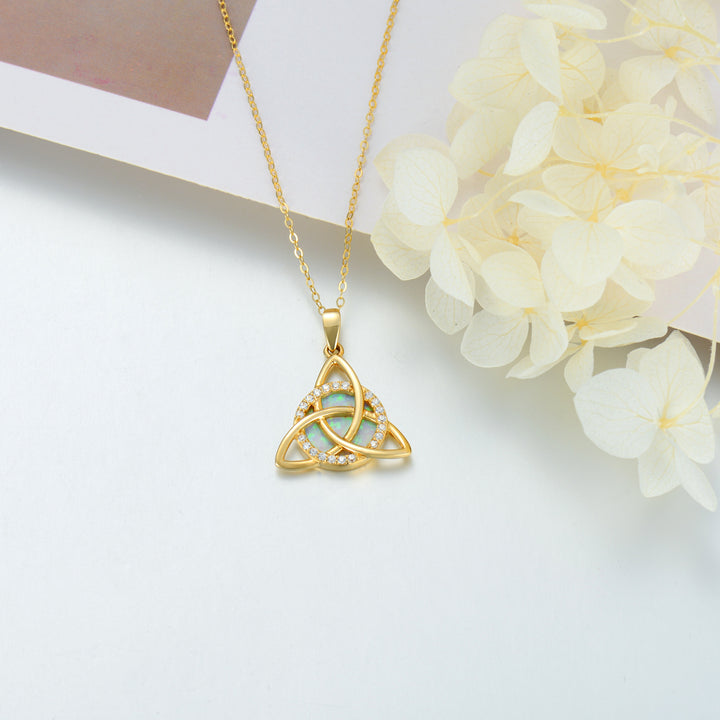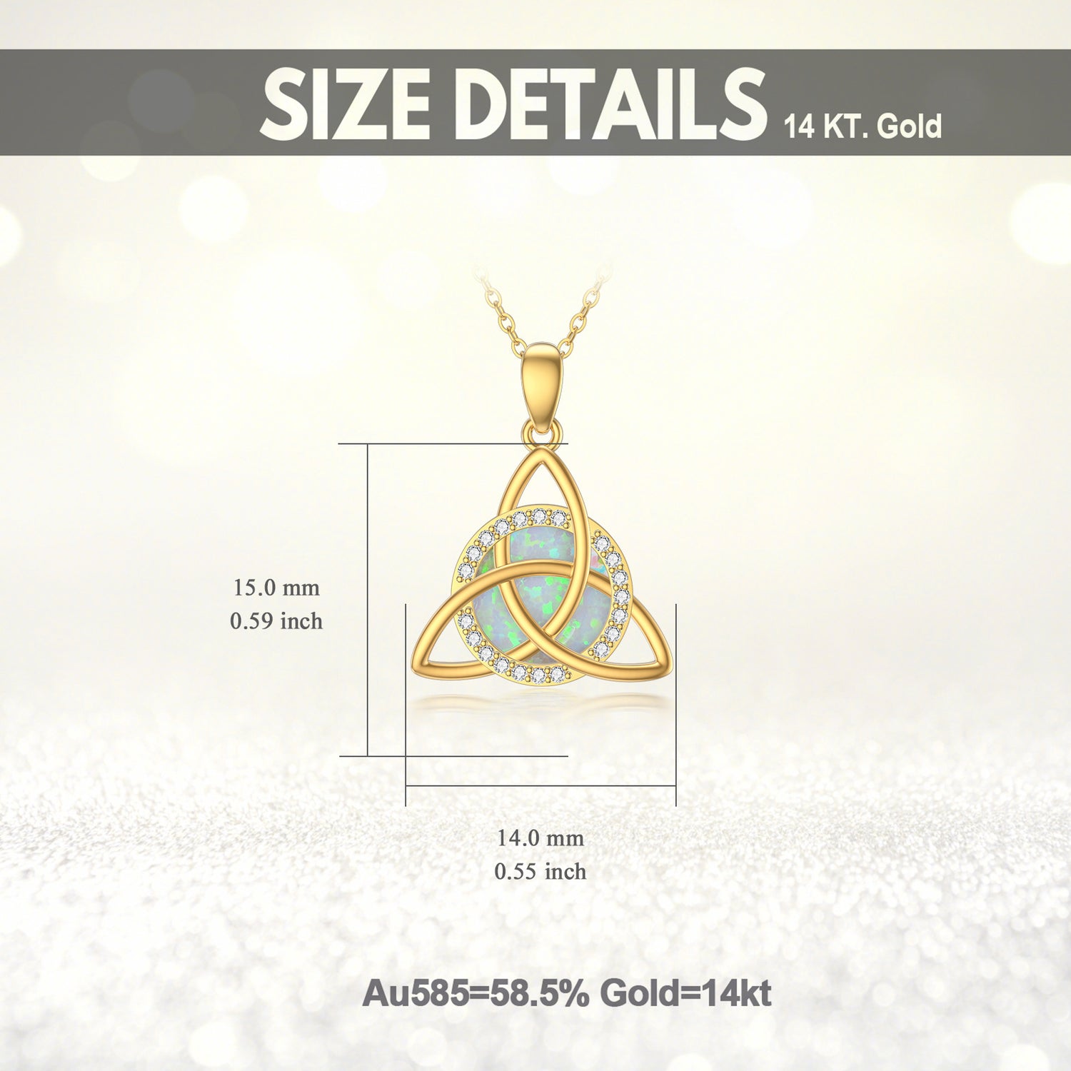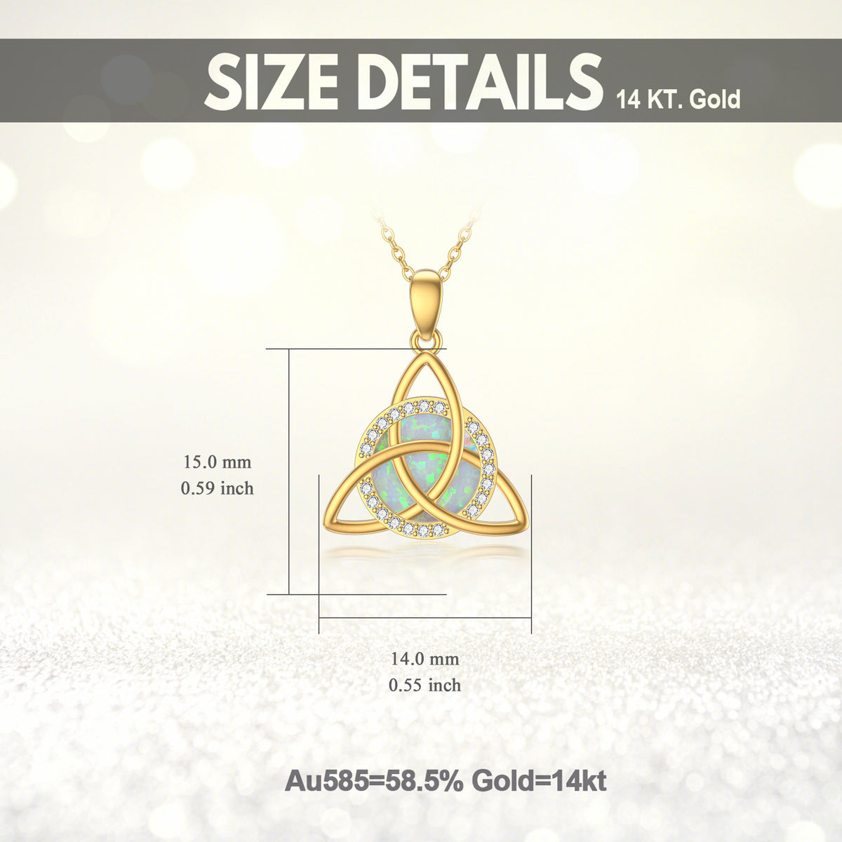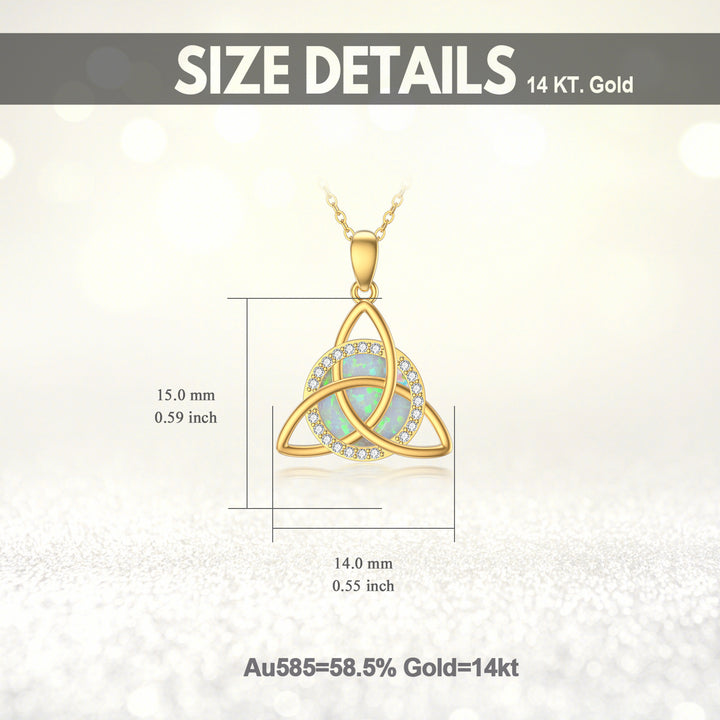 Crafted from 14K solid gold. Features a pendant with an intricate Celtic Knot design. Embellished with Cubic Zirconia and a mesmerizing Opal centerpiece.
