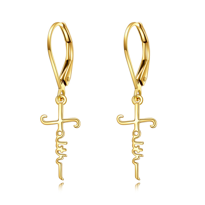 Crafted in 14K gold. Features minimalist cross motif with drop earring design. Hypoallergenic.