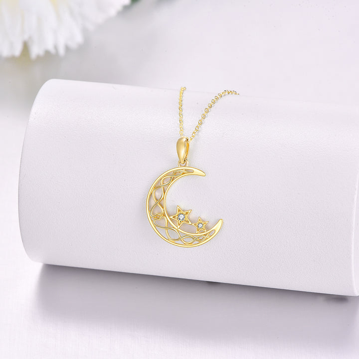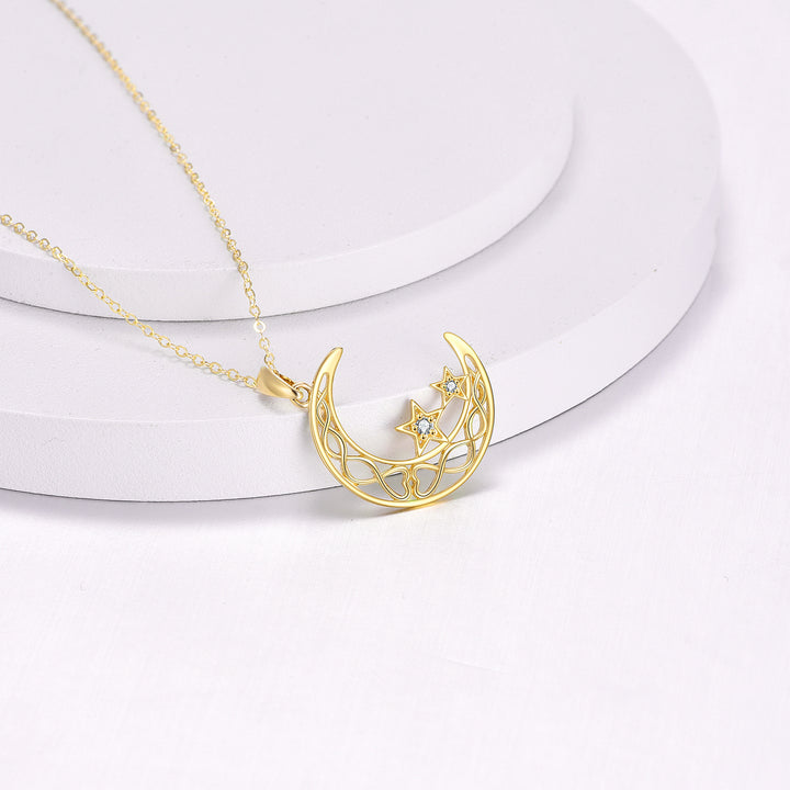 14K Gold Circular Shaped Cubic Zirconia Moon & Star Pendant Necklace