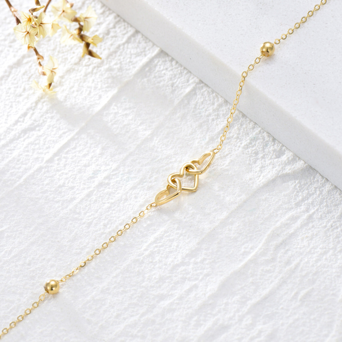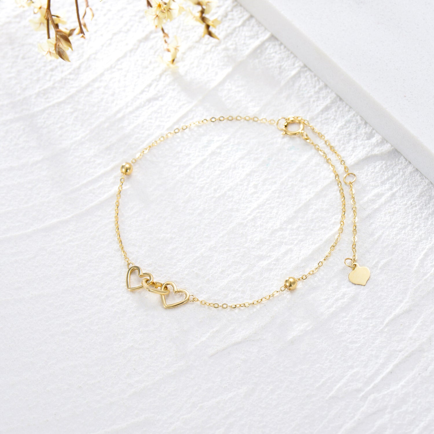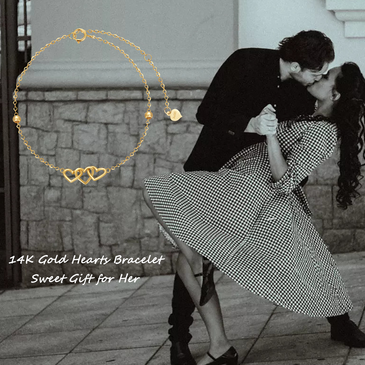 This 14K Gold Three Heart Charm Bracelet With Solid Gold Beads by YFN is a no-stone, elegant charm bracelet for women. Meticulously crafted from 14K Gold without gemstones, this piece features a unique Heart With Heart motif, showcasing the beauty of pure gold.