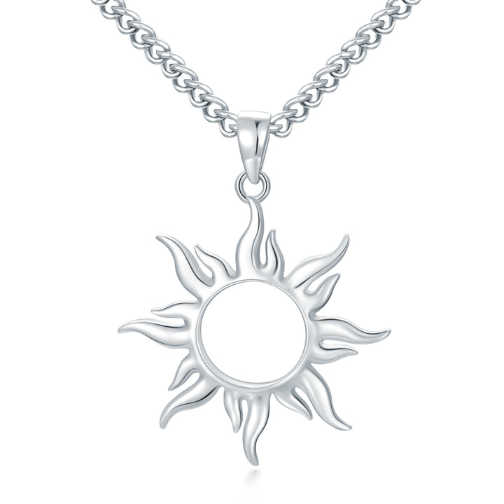 This pendant necklace is crafted entirely from Solid 925 Sterling Silver, finished with White Gold Plating, featuring a detailed, stone-free sun pendant.