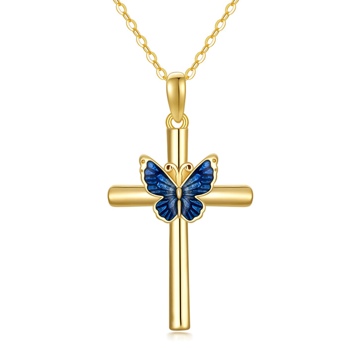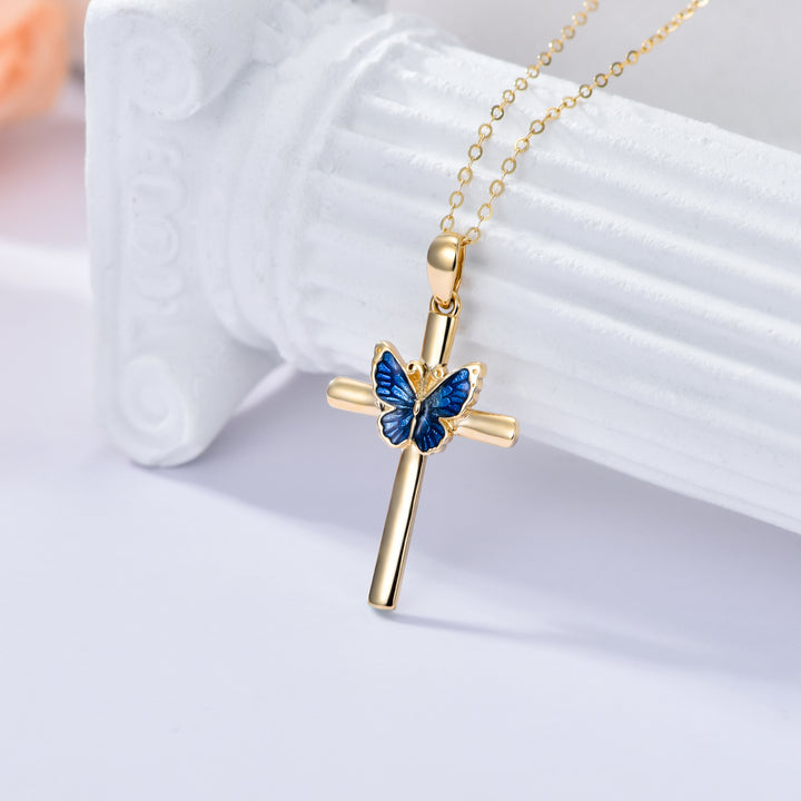 14K Gold Blue Glaze Butterfly Cross Pendant Necklace
