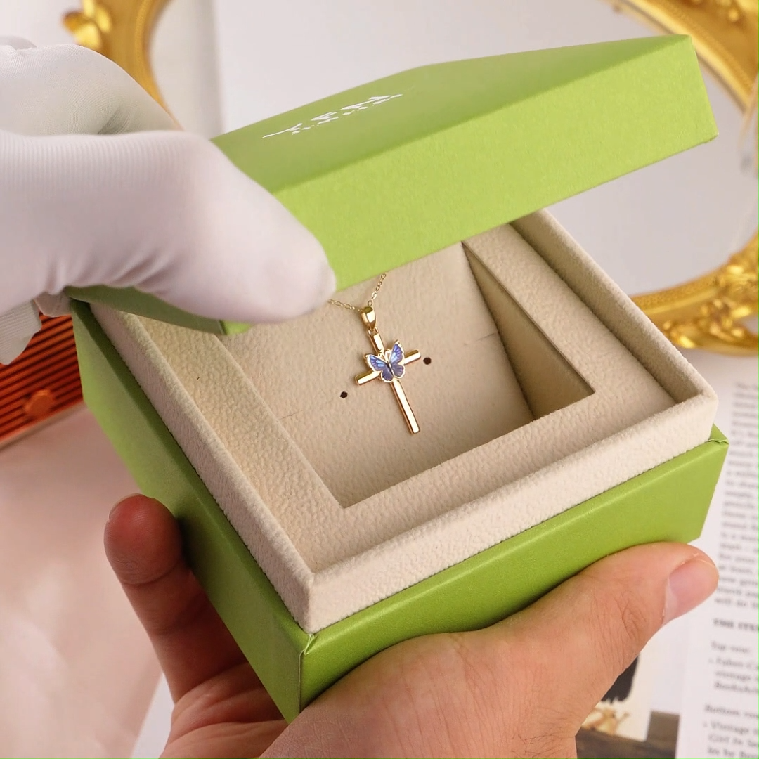 This 14K Gold Blue Glaze Butterfly Cross Pendant Necklace by YFN is a stunning, stone-free piece for women who appreciate timeless sophistication. Crafted from high-quality 14K Gold, this Pendant Necklace combines the delicate beauty of a Butterfly with the timeless symbol of a Cross, allowing the purity of the gold and the intricate design to take center stage.