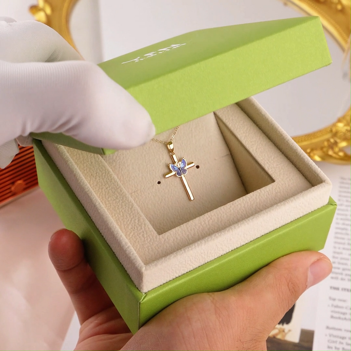 This stone-free Pendant Necklace is crafted from 14K Gold, combining the delicate beauty of a Butterfly with the timeless symbol of a Cross.
