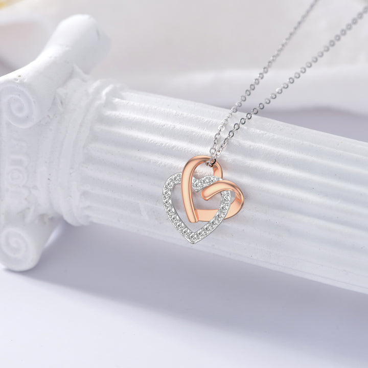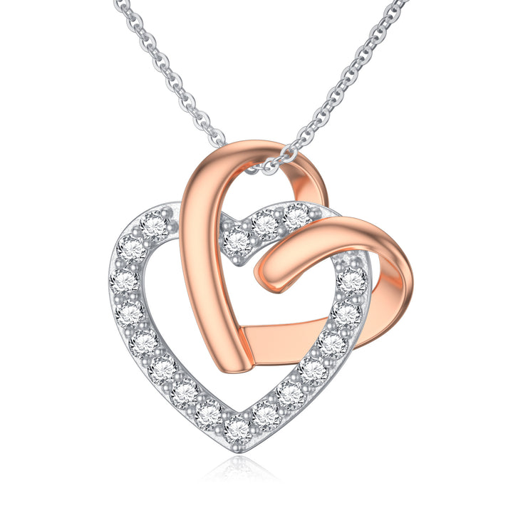 This 9K Gold Two-tone Cubic Zirconia Heart With Heart Pendant Necklace by YFN expresses layered affection through its double-heart motif accented with bright zircon stones. The warm rose gold finish adds a romantic glow, making it a graceful token of sentiment and style.