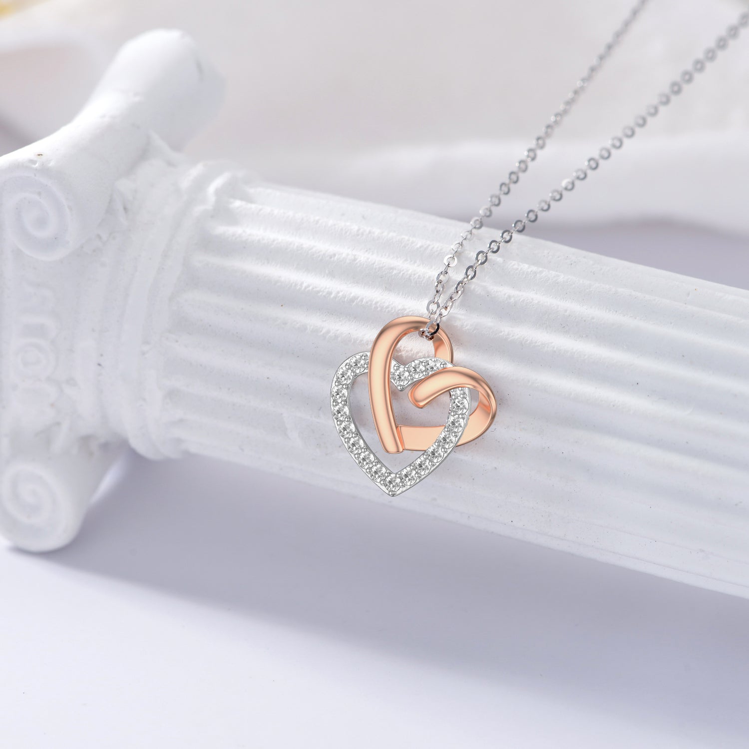 9K Gold Two Tone Cubic Zirconia Heart With Heart Pendant Necklace For Women
