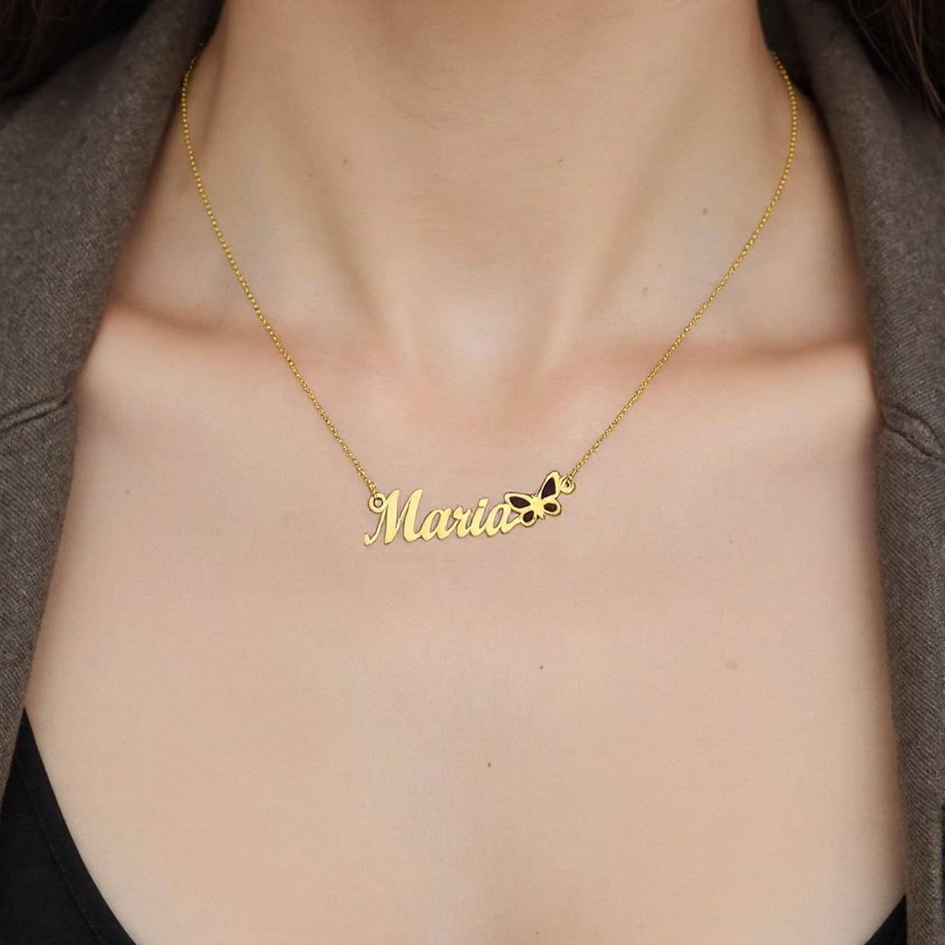 This pendant necklace is crafted entirely from Solid 10K Gold (Yellow Gold) and features a stone-free butterfly pendant and a customizable classic nameplate, suspended from a gold chain.