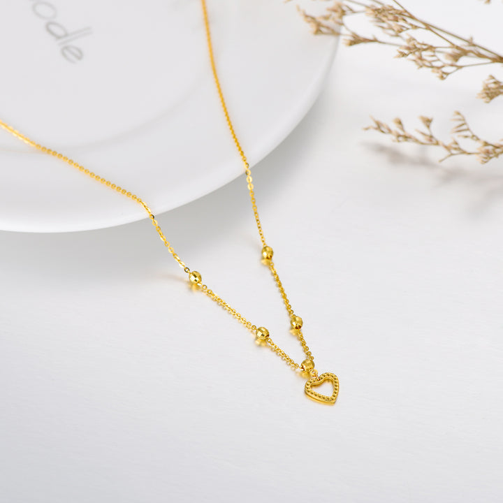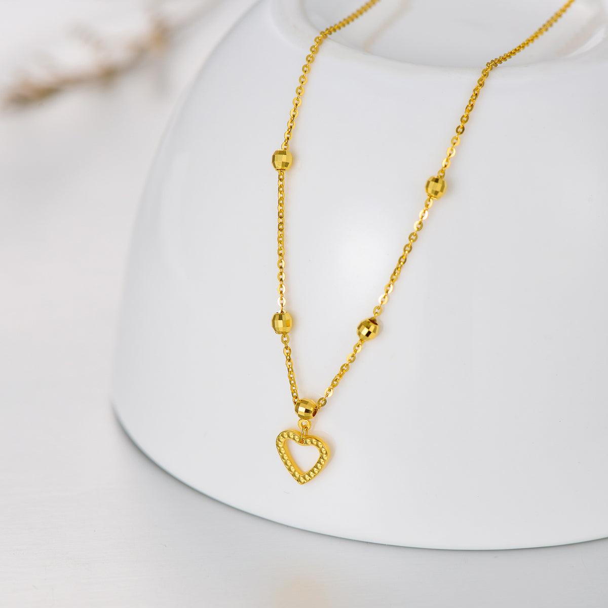 This 18K Gold Bead & Heart Necklace by YFN showcases minimalist luxury through its refined bead detailing and elegantly sculpted heart charm. Crafted for women drawn to timeless simplicity, the necklace highlights the warm glow of 18K gold without the distraction of stones. Lightweight and comfortable for daily wear, it adds a subtle elegance that complements both casual and formal ensembles. The heart motif symbolizes love and connection, making it a meaningful gift or personal keepsake. Understated yet sophisticated, this piece embodies effortless modern elegance.