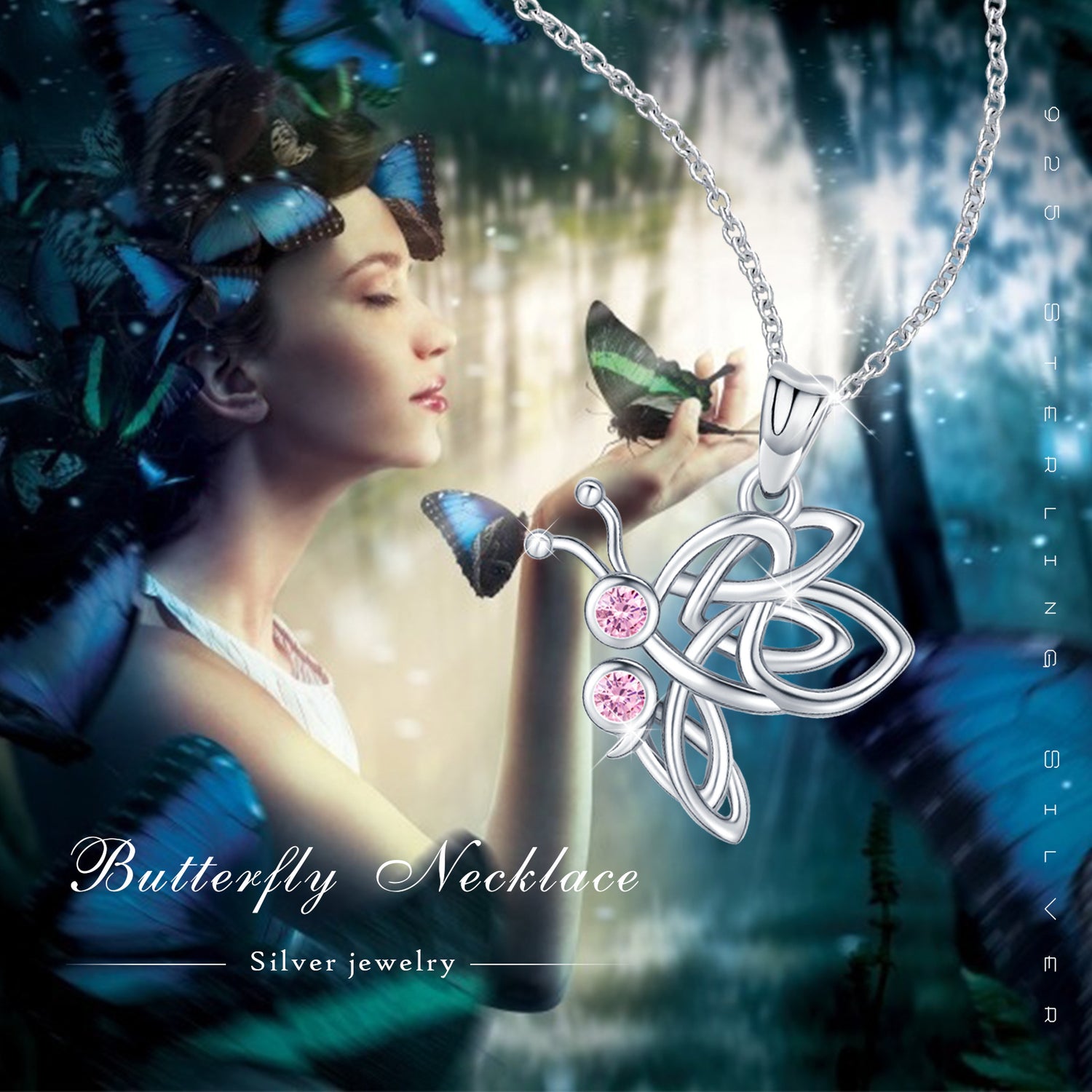 Crafted in sterling silver with white gold plating and pink cubic zirconia stones. Includes circular pendant with butterfly motif and matching chain.