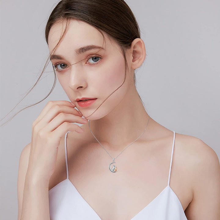 Sterling Silver Two-tone Fox & Moon Pendant Necklace with Engraved Word